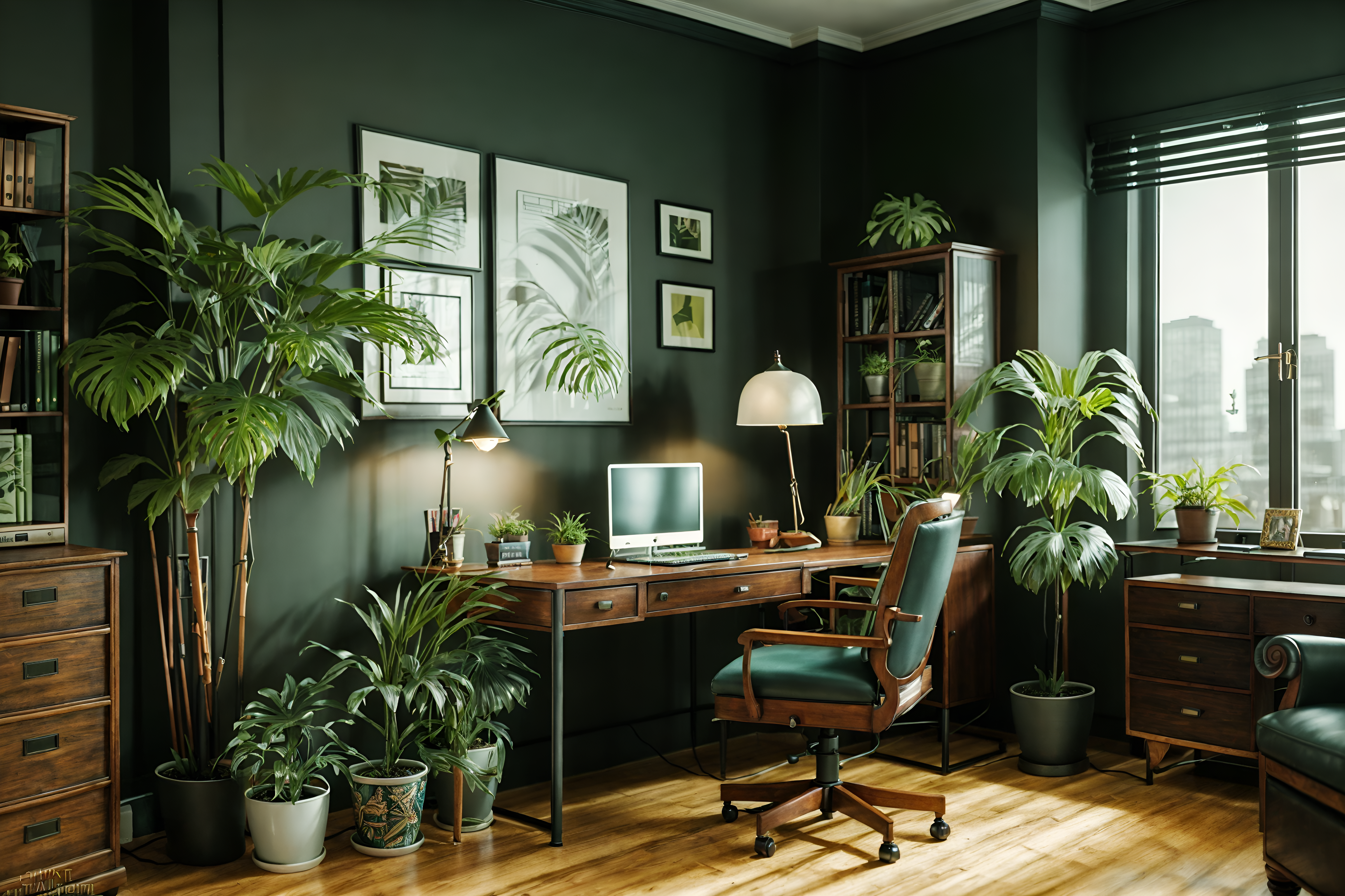 photo from pinterest of eclectic-style interior designed (home office interior) with plant and desk lamp and cabinets and computer desk and office chair and plant cinematic photo, highly detailed, cinematic lighting, ultra-detailed, ultrarealistic, photorealism, 8k. trending on pinterest. eclectic interior design style. masterpiece, cinematic light, ultrarealistic+, photorealistic+, 8k, raw photo, realistic, sharp focus on eyes, (symmetrical eyes), (intact eyes), hyperrealistic, highest quality, best quality, , highly detailed, masterpiece, best quality, extremely detailed 8k wallpaper, masterpiece, best quality, ultra-detailed, best shadow, detailed background, detailed face, detailed eyes, high contrast, best illumination, detailed face, dulux, caustic, dynamic angle, detailed glow. dramatic lighting. highly detailed, insanely detailed hair, symmetrical, intricate details, professionally retouched, 8k high definition. strong bokeh. award winning photo.