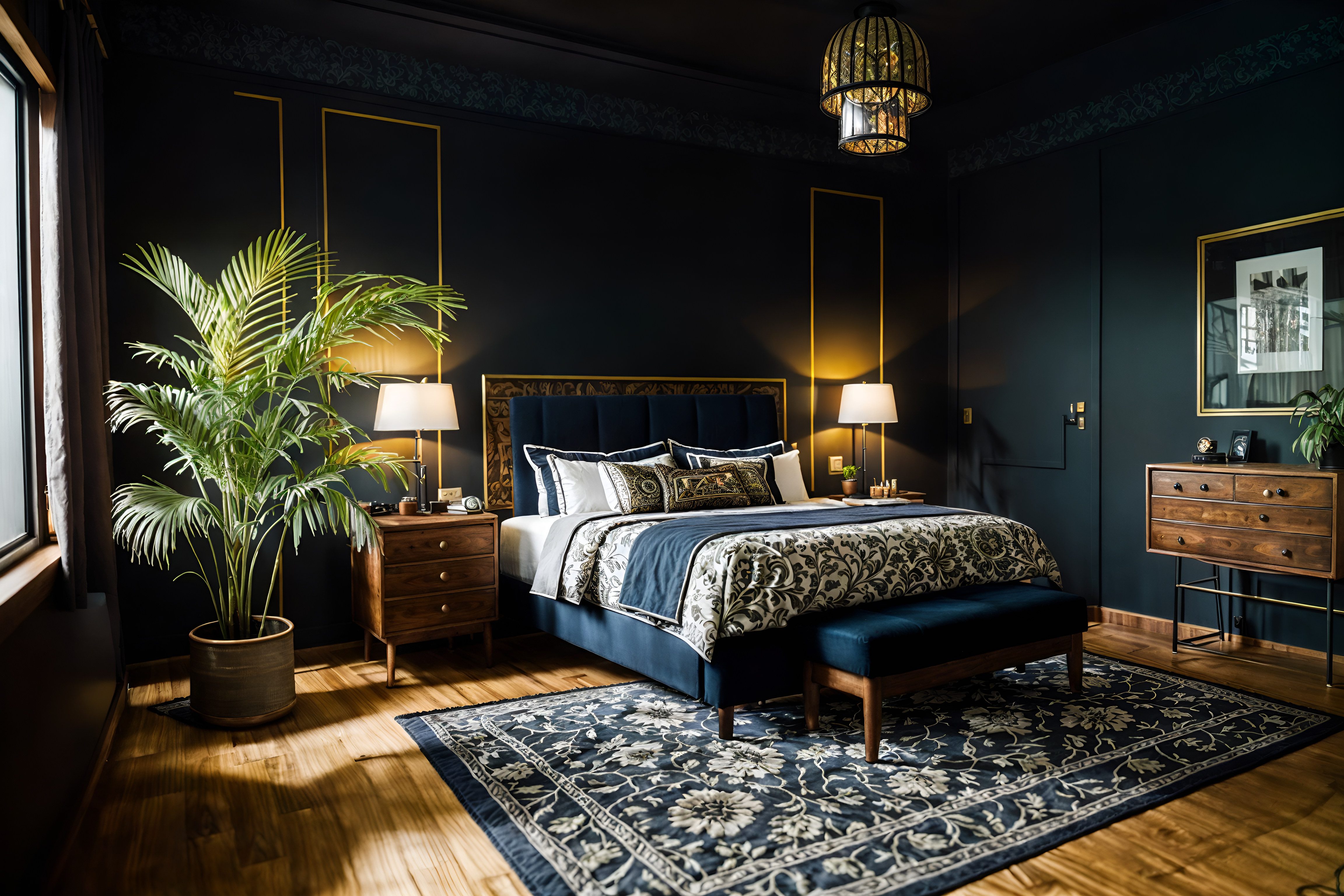 photo from pinterest of eclectic-style interior designed (hotel room interior) with bedside table or night stand and plant and bed and storage bench or ottoman and working desk with desk chair and night light and hotel bathroom and headboard cinematic photo, highly detailed, cinematic lighting, ultra-detailed, ultrarealistic, photorealism, 8k. trending on pinterest. eclectic interior design style. masterpiece, cinematic light, ultrarealistic+, photorealistic+, 8k, raw photo, realistic, sharp focus on eyes, (symmetrical eyes), (intact eyes), hyperrealistic, highest quality, best quality, , highly detailed, masterpiece, best quality, extremely detailed 8k wallpaper, masterpiece, best quality, ultra-detailed, best shadow, detailed background, detailed face, detailed eyes, high contrast, best illumination, detailed face, dulux, caustic, dynamic angle, detailed glow. dramatic lighting. highly detailed, insanely detailed hair, symmetrical, intricate details, professionally retouched, 8k high definition. strong bokeh. award winning photo.