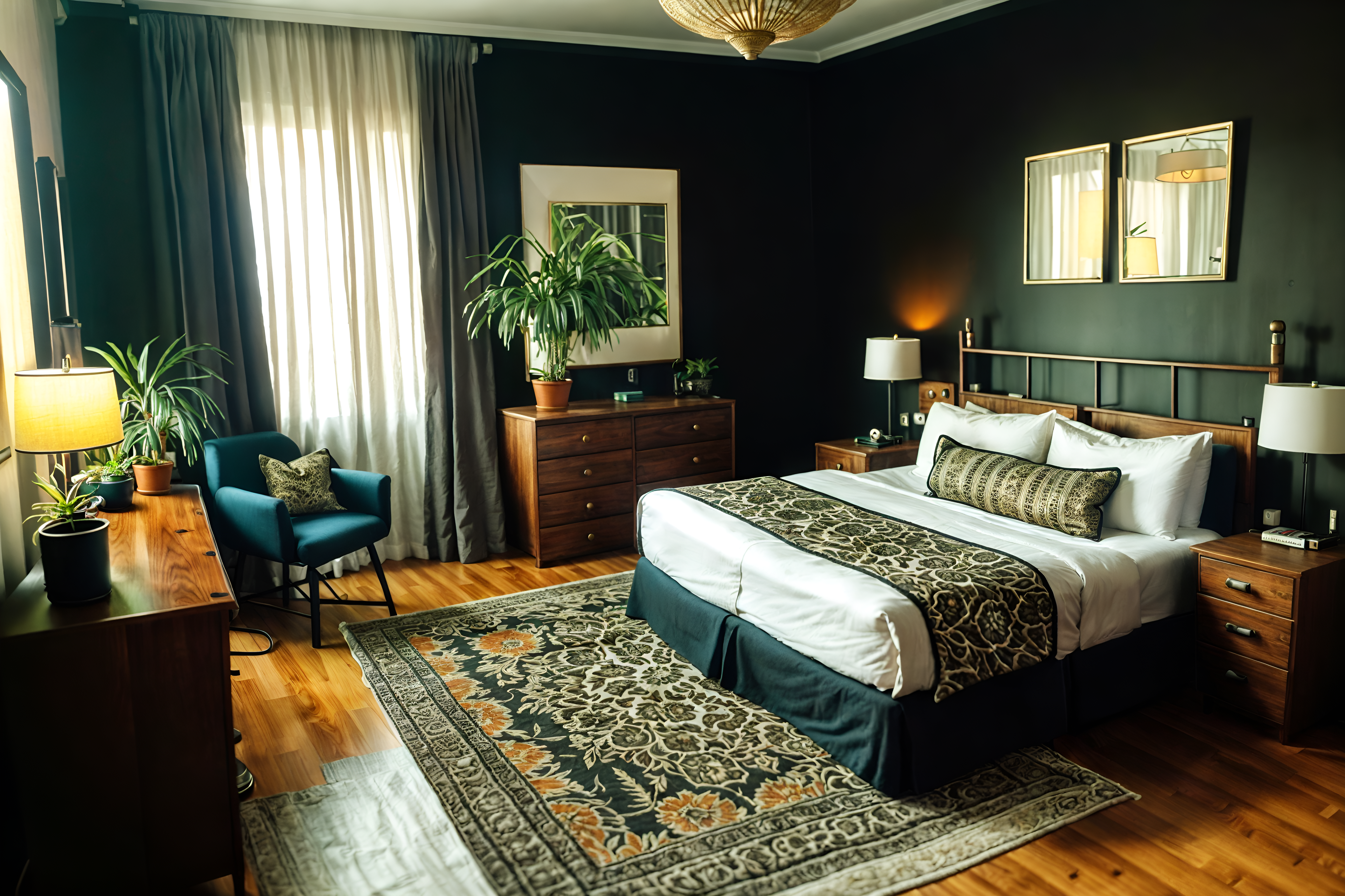 photo from pinterest of eclectic-style interior designed (hotel room interior) with bedside table or night stand and plant and bed and storage bench or ottoman and working desk with desk chair and night light and hotel bathroom and headboard cinematic photo, highly detailed, cinematic lighting, ultra-detailed, ultrarealistic, photorealism, 8k. trending on pinterest. eclectic interior design style. masterpiece, cinematic light, ultrarealistic+, photorealistic+, 8k, raw photo, realistic, sharp focus on eyes, (symmetrical eyes), (intact eyes), hyperrealistic, highest quality, best quality, , highly detailed, masterpiece, best quality, extremely detailed 8k wallpaper, masterpiece, best quality, ultra-detailed, best shadow, detailed background, detailed face, detailed eyes, high contrast, best illumination, detailed face, dulux, caustic, dynamic angle, detailed glow. dramatic lighting. highly detailed, insanely detailed hair, symmetrical, intricate details, professionally retouched, 8k high definition. strong bokeh. award winning photo.
