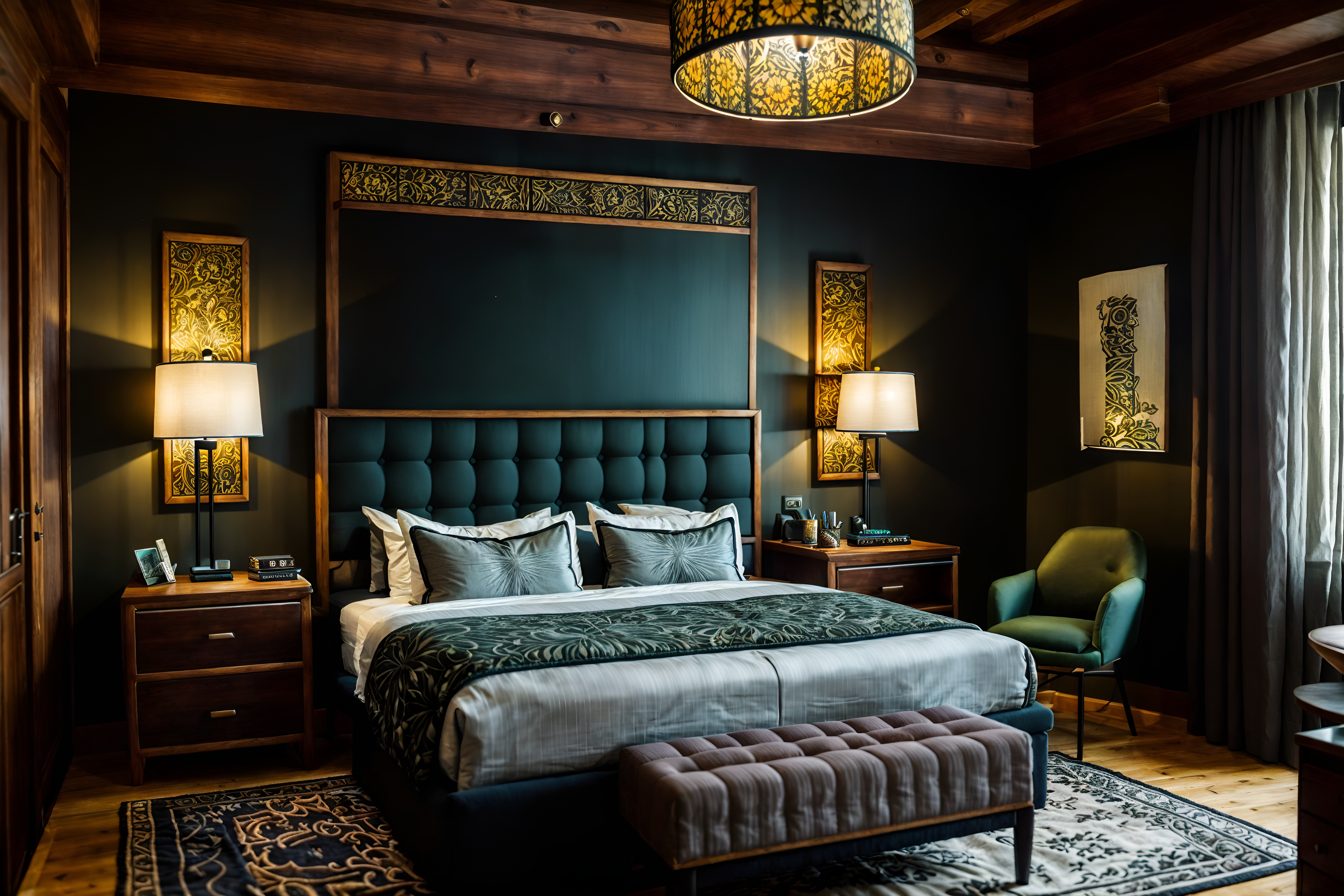 photo from pinterest of eclectic-style interior designed (hotel room interior) with bedside table or night stand and plant and bed and storage bench or ottoman and working desk with desk chair and night light and hotel bathroom and headboard cinematic photo, highly detailed, cinematic lighting, ultra-detailed, ultrarealistic, photorealism, 8k. trending on pinterest. eclectic interior design style. masterpiece, cinematic light, ultrarealistic+, photorealistic+, 8k, raw photo, realistic, sharp focus on eyes, (symmetrical eyes), (intact eyes), hyperrealistic, highest quality, best quality, , highly detailed, masterpiece, best quality, extremely detailed 8k wallpaper, masterpiece, best quality, ultra-detailed, best shadow, detailed background, detailed face, detailed eyes, high contrast, best illumination, detailed face, dulux, caustic, dynamic angle, detailed glow. dramatic lighting. highly detailed, insanely detailed hair, symmetrical, intricate details, professionally retouched, 8k high definition. strong bokeh. award winning photo.