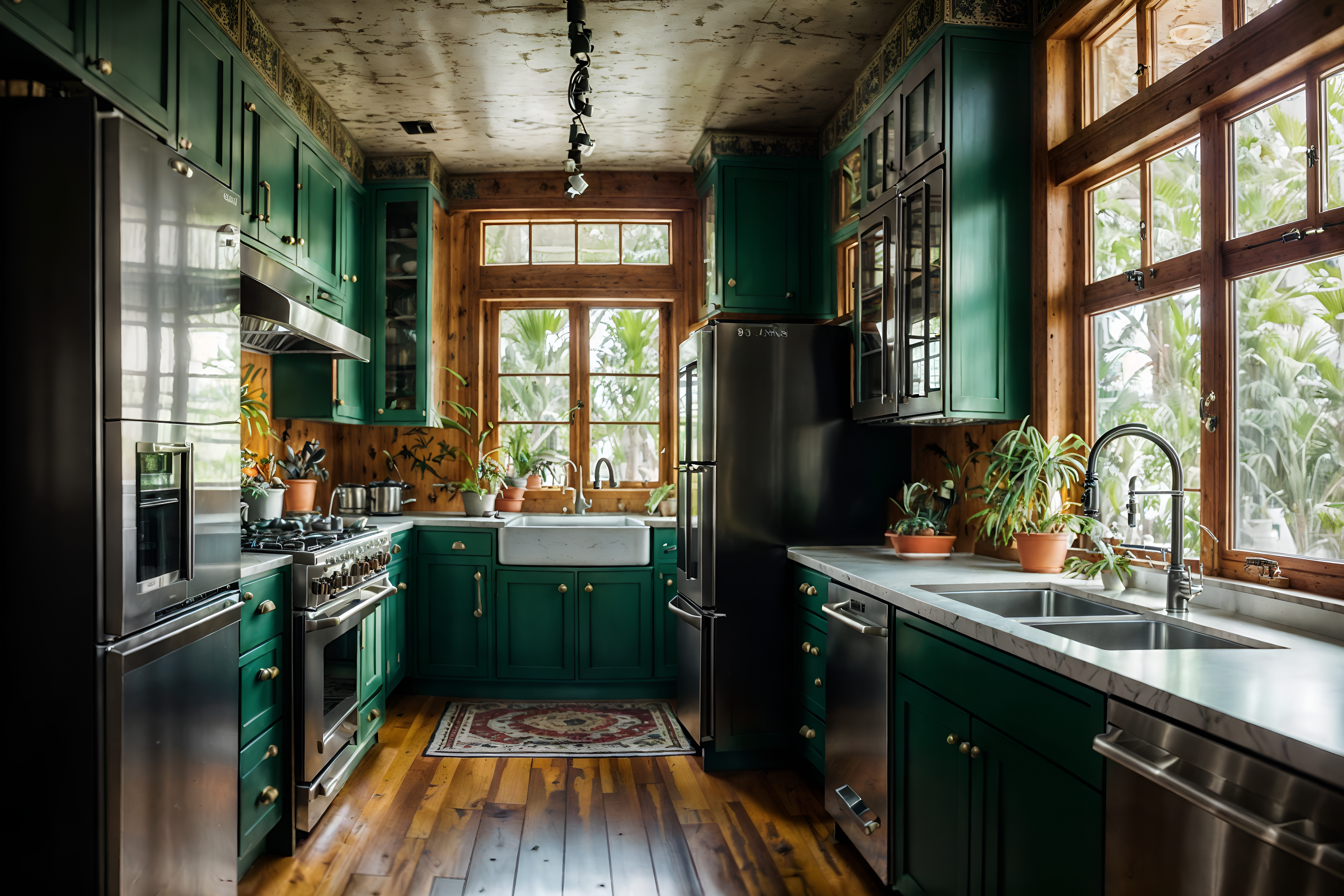 photo from pinterest of eclectic-style interior designed (kitchen interior) with refrigerator and sink and kitchen cabinets and stove and worktops and plant and refrigerator cinematic photo, highly detailed, cinematic lighting, ultra-detailed, ultrarealistic, photorealism, 8k. trending on pinterest. eclectic interior design style. masterpiece, cinematic light, ultrarealistic+, photorealistic+, 8k, raw photo, realistic, sharp focus on eyes, (symmetrical eyes), (intact eyes), hyperrealistic, highest quality, best quality, , highly detailed, masterpiece, best quality, extremely detailed 8k wallpaper, masterpiece, best quality, ultra-detailed, best shadow, detailed background, detailed face, detailed eyes, high contrast, best illumination, detailed face, dulux, caustic, dynamic angle, detailed glow. dramatic lighting. highly detailed, insanely detailed hair, symmetrical, intricate details, professionally retouched, 8k high definition. strong bokeh. award winning photo.
