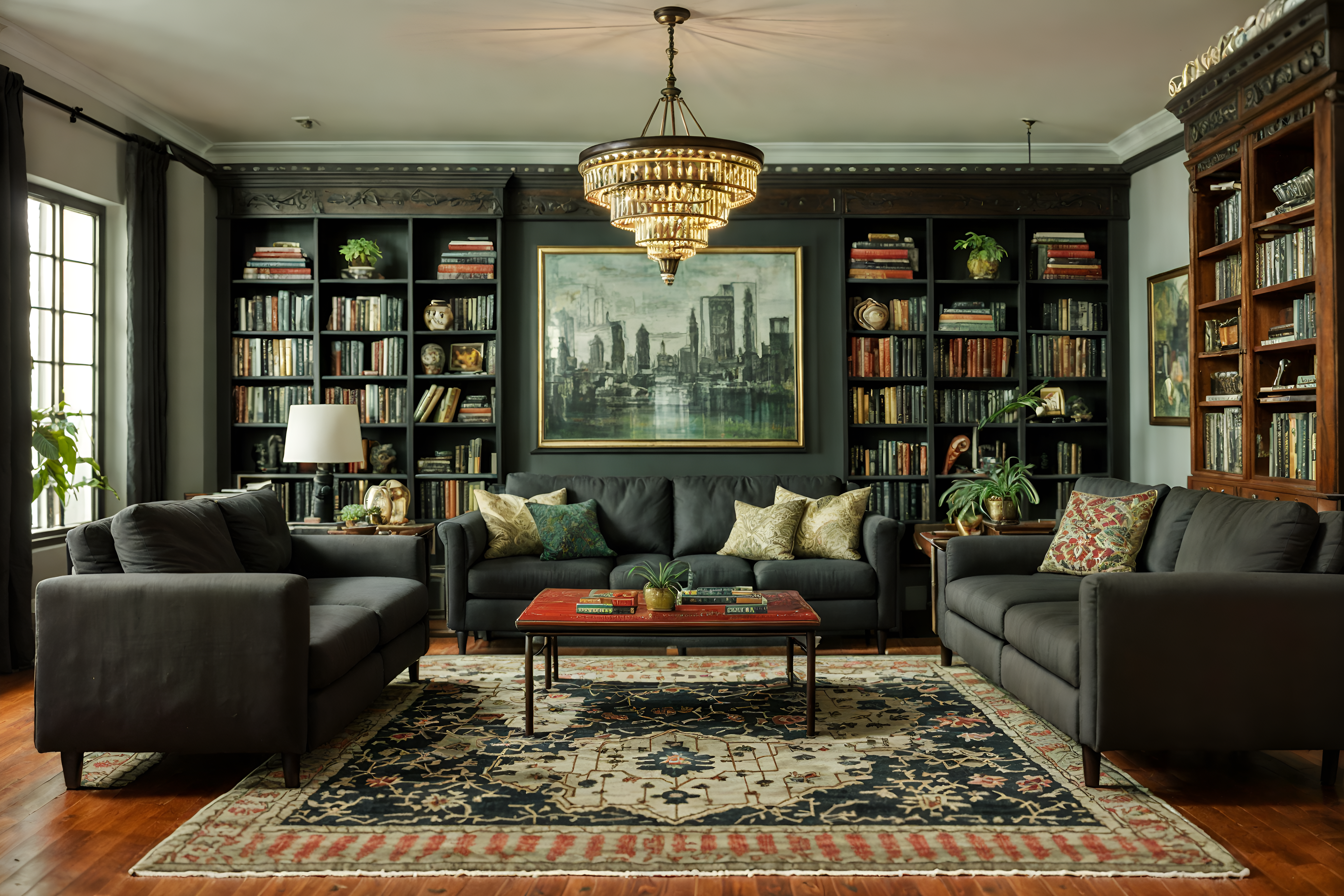 photo from pinterest of eclectic-style interior designed (living room interior) with furniture and occasional tables and plant and bookshelves and sofa and chairs and coffee tables and rug cinematic photo, highly detailed, cinematic lighting, ultra-detailed, ultrarealistic, photorealism, 8k. trending on pinterest. eclectic interior design style. masterpiece, cinematic light, ultrarealistic+, photorealistic+, 8k, raw photo, realistic, sharp focus on eyes, (symmetrical eyes), (intact eyes), hyperrealistic, highest quality, best quality, , highly detailed, masterpiece, best quality, extremely detailed 8k wallpaper, masterpiece, best quality, ultra-detailed, best shadow, detailed background, detailed face, detailed eyes, high contrast, best illumination, detailed face, dulux, caustic, dynamic angle, detailed glow. dramatic lighting. highly detailed, insanely detailed hair, symmetrical, intricate details, professionally retouched, 8k high definition. strong bokeh. award winning photo.