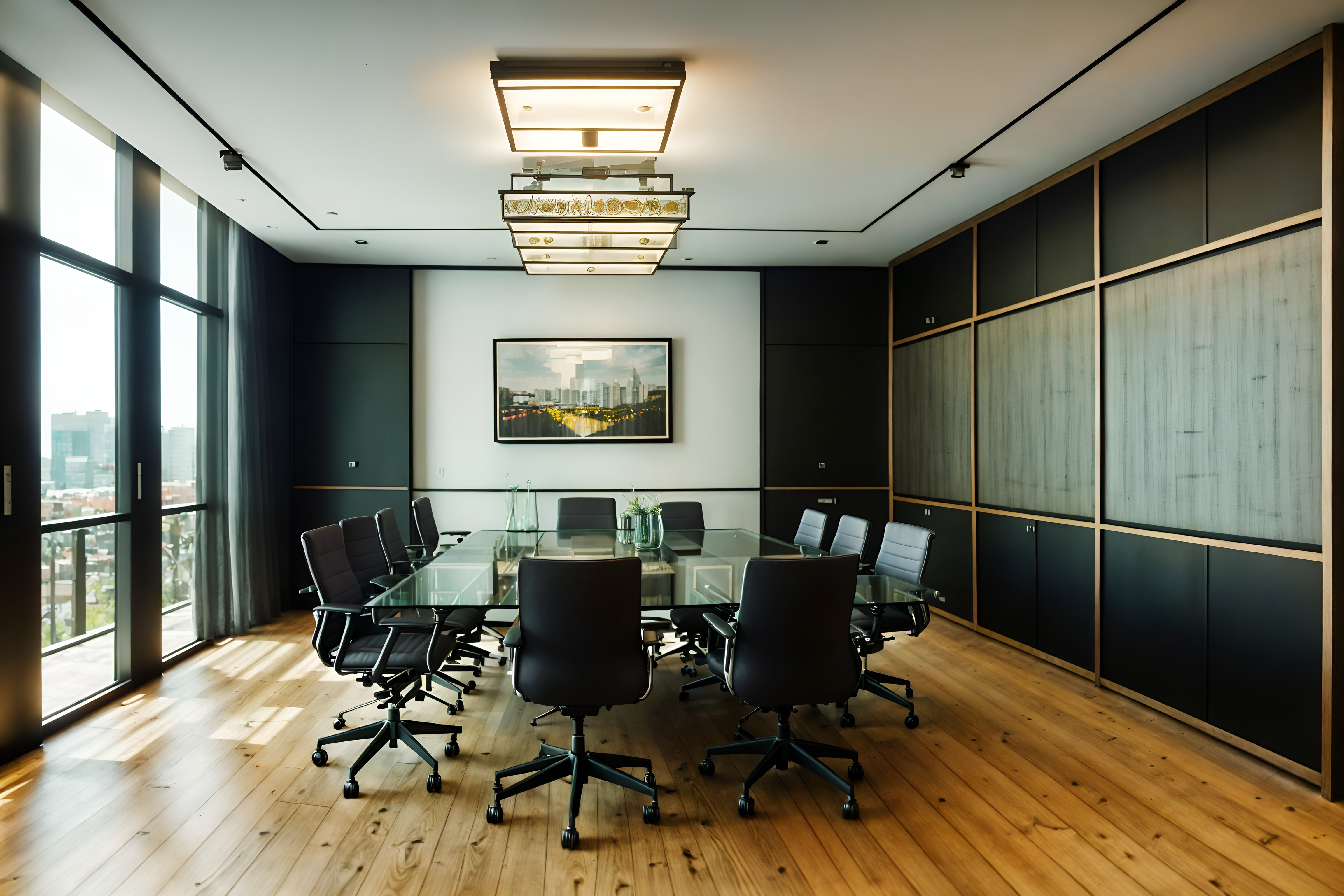 photo from pinterest of eclectic-style interior designed (meeting room interior) with office chairs and painting or photo on wall and vase and glass doors and glass walls and boardroom table and plant and cabinets cinematic photo, highly detailed, cinematic lighting, ultra-detailed, ultrarealistic, photorealism, 8k. trending on pinterest. eclectic interior design style. masterpiece, cinematic light, ultrarealistic+, photorealistic+, 8k, raw photo, realistic, sharp focus on eyes, (symmetrical eyes), (intact eyes), hyperrealistic, highest quality, best quality, , highly detailed, masterpiece, best quality, extremely detailed 8k wallpaper, masterpiece, best quality, ultra-detailed, best shadow, detailed background, detailed face, detailed eyes, high contrast, best illumination, detailed face, dulux, caustic, dynamic angle, detailed glow. dramatic lighting. highly detailed, insanely detailed hair, symmetrical, intricate details, professionally retouched, 8k high definition. strong bokeh. award winning photo.