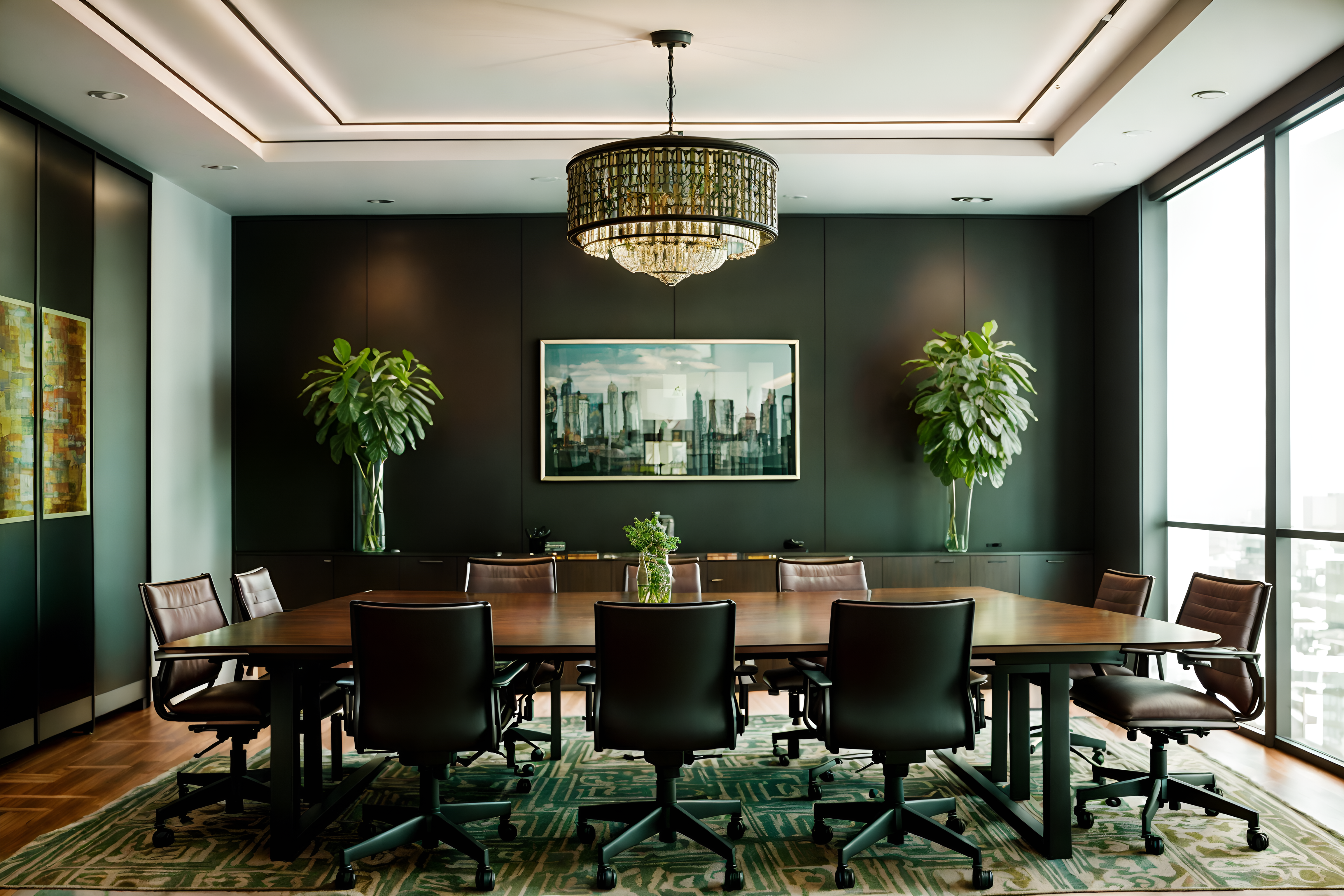 photo from pinterest of eclectic-style interior designed (meeting room interior) with office chairs and painting or photo on wall and vase and glass doors and glass walls and boardroom table and plant and cabinets cinematic photo, highly detailed, cinematic lighting, ultra-detailed, ultrarealistic, photorealism, 8k. trending on pinterest. eclectic interior design style. masterpiece, cinematic light, ultrarealistic+, photorealistic+, 8k, raw photo, realistic, sharp focus on eyes, (symmetrical eyes), (intact eyes), hyperrealistic, highest quality, best quality, , highly detailed, masterpiece, best quality, extremely detailed 8k wallpaper, masterpiece, best quality, ultra-detailed, best shadow, detailed background, detailed face, detailed eyes, high contrast, best illumination, detailed face, dulux, caustic, dynamic angle, detailed glow. dramatic lighting. highly detailed, insanely detailed hair, symmetrical, intricate details, professionally retouched, 8k high definition. strong bokeh. award winning photo.