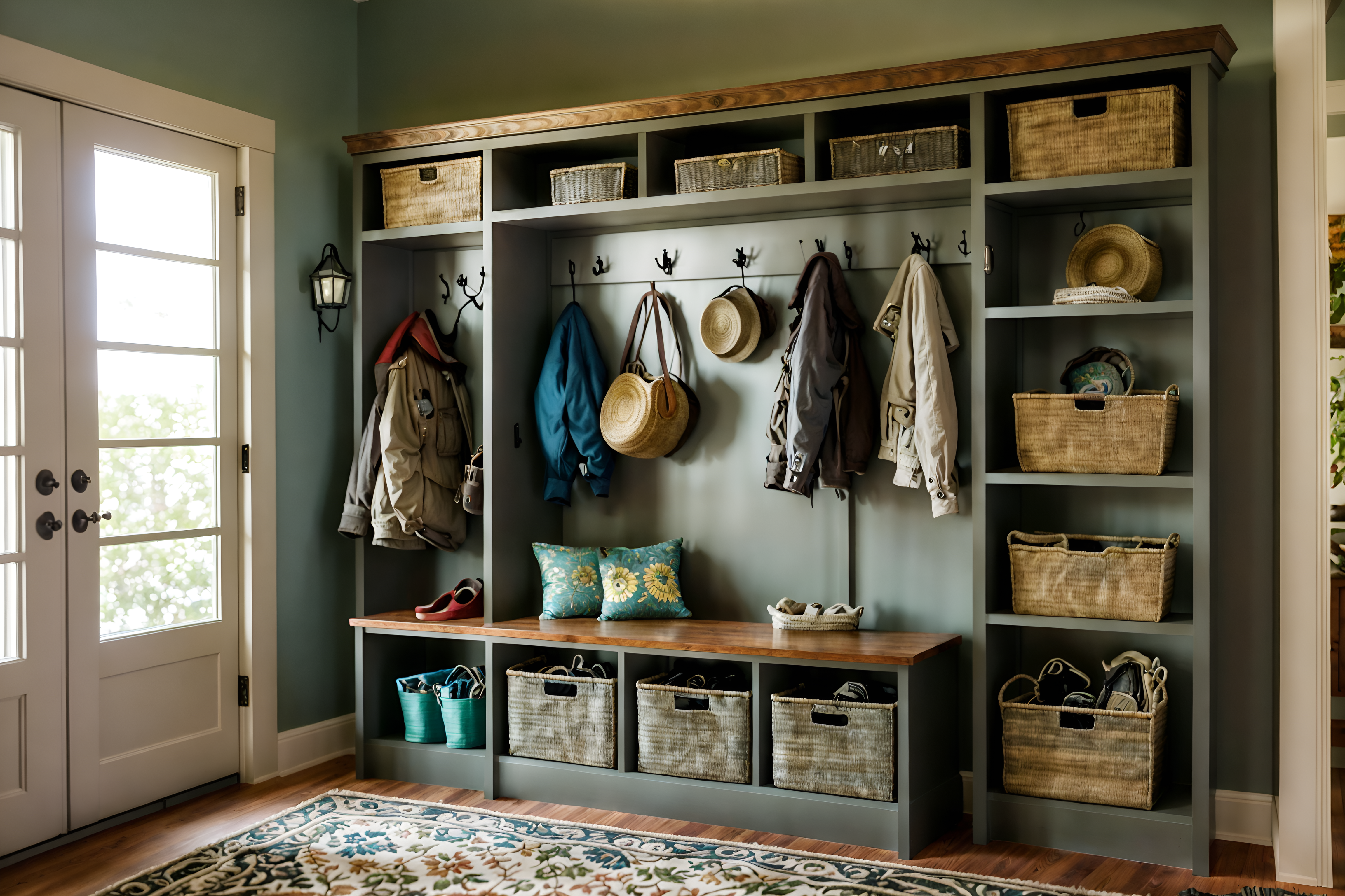 mudroomsinterior decorate this mudroom with scandinavian style. . . with storage baskets and cubbies and wall hooks for coats and high up storage and shelves for shoes and storage drawers and cabinets and a bench. . with light wood and white decor and hygge and clean lines and minimalist design and textured fabrics and natural light and cozy atmosphere. . .interior decorate this mudroom with contemporary style. . . with wall hooks for coats and cabinets and shelves for shoes and high up storage and storage baskets and a bench and cubbies and storage drawers. . with high contrast and neutral palette and open spaces and glass decor and elegant simplicity and modern finishes and sleek lines and clean look. . .interior decorate this mudroom with mediterranean style. . . with high up storage and storage baskets and shelves for shoes and cabinets and a bench and wall hooks for coats and storage drawers and cubbies. . with mosaic patterns and wrought iron and arched doorways and terracotta tiles and sun-drenched and warm earth tones and outdoor living and blue and white. . .interior decorate this mudroom with neoclassic style. . . with storage drawers and cubbies and storage baskets and cabinets and high up storage and shelves for shoes and a bench and wall hooks for coats. . with emphasized horizontal and vertical lines and timeless furniture and timeless artwork and symmetric layouts and thoughtful minimalism and classical architectural details and geometric decorative elements and spacious rooms. . .interior decorate this mudroom with industrial style. . . with high up storage and storage baskets and a bench and storage drawers and wall hooks for coats and shelves for shoes and cabinets and cubbies. . with exposed concrete and exposed brick and metal panels and neutral tones and utilitarian objects and factory style and reclaimed wood and open floorplan. . .interior decorate this mudroom with post-apocalyptic style. . . with wall hooks for coats and storage baskets and a bench and cabinets and storage drawers and shelves for shoes and high up storage and cubbies. . with makeshift furniture and industrial elements and run-down favela style and weathered materials and cracked concrete walls and survival-inspired and graffiti on walls and dirty floor. . .interior decorate this mudroom with coastal style. . . with shelves for shoes and storage baskets and a bench and cabinets and high up storage and cubbies and storage drawers and wall hooks for coats. . with airy feel and sand tones and white decor and natural materials and nautical decor and light blue and beach vibes and ocean-inspired. . .interior decorate this mudroom with boho-chic style. . . with storage drawers and storage baskets and cubbies and cabinets and wall hooks for coats and shelves for shoes and high up storage and a bench. . with global artifacts and bohemian flair and natural materials and layered textiles and artistic touches and vintage finds and eclectic mix and relaxed atmosphere. . .interior decorate this mudroom with eco-friendly style. . . with a bench and cabinets and storage drawers and storage baskets and high up storage and cubbies and shelves for shoes and wall hooks for coats. . with organic textiles and renewable resources and non-toxic finishes and environmentally conscious and energy efficient and natural fibers and green living and reclaimed wood. . .