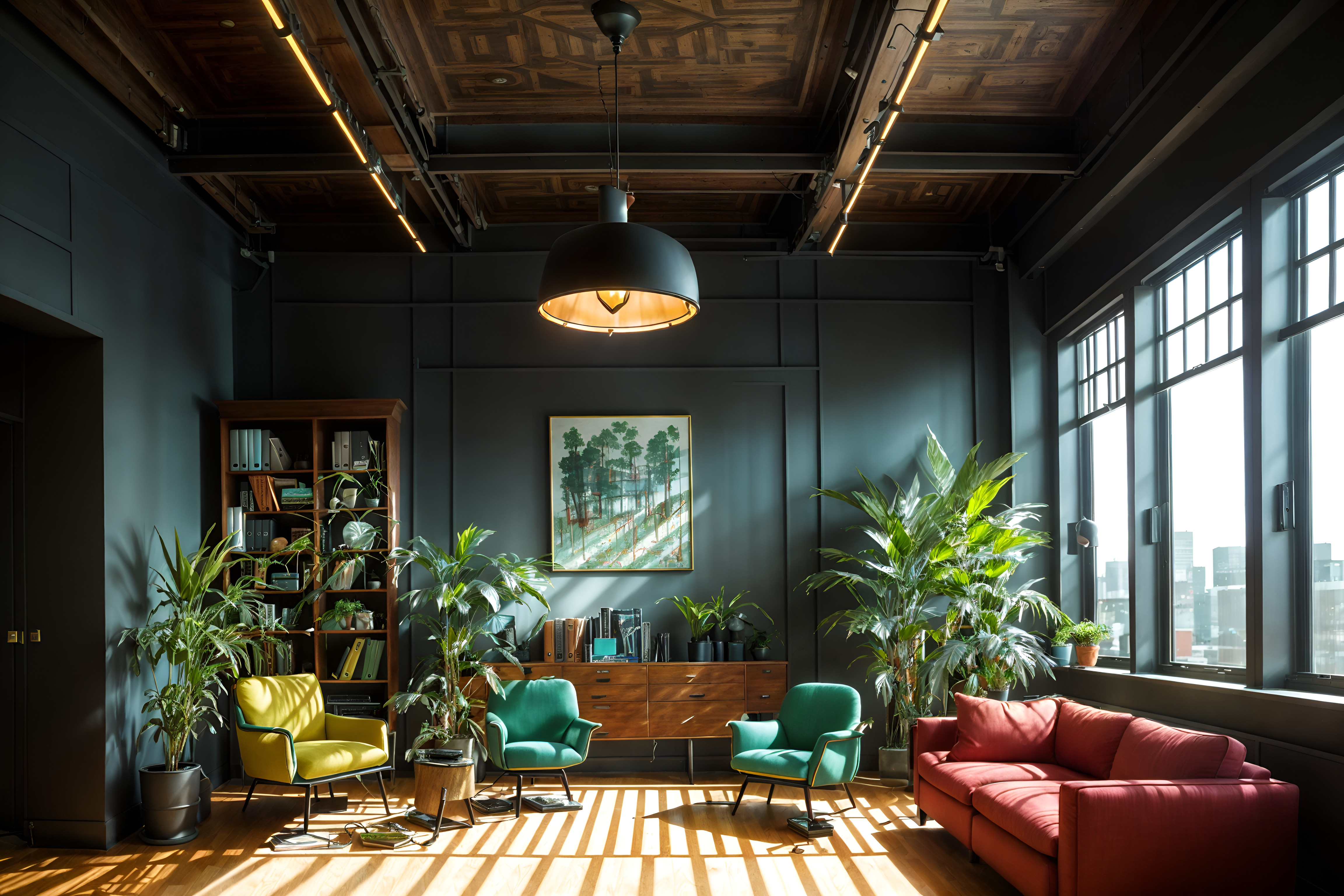 photo from pinterest of eclectic-style interior designed (office interior) with windows and seating area with sofa and computer desks and desk lamps and lounge chairs and cabinets and plants and office desks cinematic photo, highly detailed, cinematic lighting, ultra-detailed, ultrarealistic, photorealism, 8k. trending on pinterest. eclectic interior design style. masterpiece, cinematic light, ultrarealistic+, photorealistic+, 8k, raw photo, realistic, sharp focus on eyes, (symmetrical eyes), (intact eyes), hyperrealistic, highest quality, best quality, , highly detailed, masterpiece, best quality, extremely detailed 8k wallpaper, masterpiece, best quality, ultra-detailed, best shadow, detailed background, detailed face, detailed eyes, high contrast, best illumination, detailed face, dulux, caustic, dynamic angle, detailed glow. dramatic lighting. highly detailed, insanely detailed hair, symmetrical, intricate details, professionally retouched, 8k high definition. strong bokeh. award winning photo.