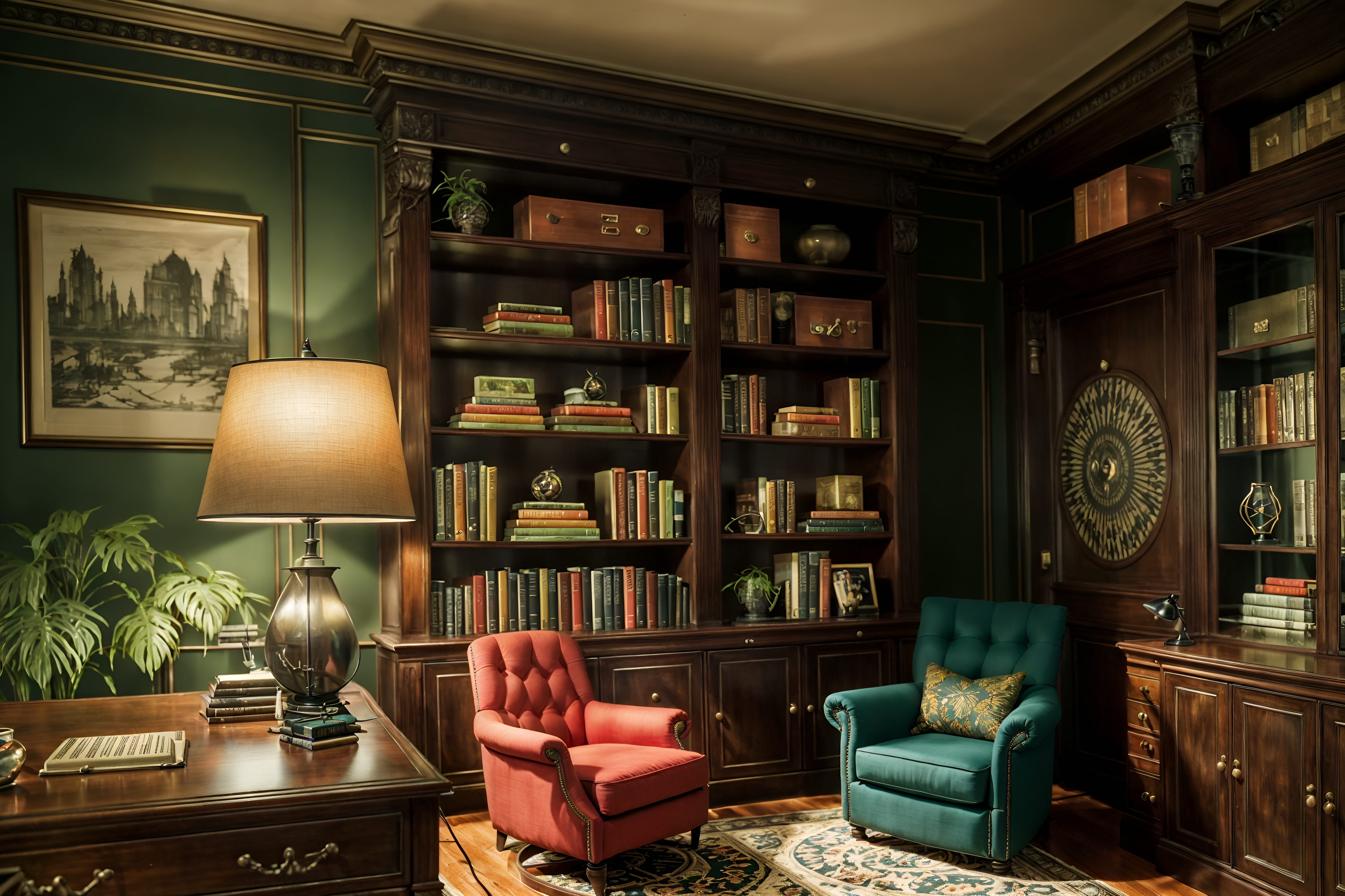 photo from pinterest of eclectic-style interior designed (study room interior) with desk lamp and lounge chair and bookshelves and cabinets and writing desk and office chair and plant and desk lamp cinematic photo, highly detailed, cinematic lighting, ultra-detailed, ultrarealistic, photorealism, 8k. trending on pinterest. eclectic interior design style. masterpiece, cinematic light, ultrarealistic+, photorealistic+, 8k, raw photo, realistic, sharp focus on eyes, (symmetrical eyes), (intact eyes), hyperrealistic, highest quality, best quality, , highly detailed, masterpiece, best quality, extremely detailed 8k wallpaper, masterpiece, best quality, ultra-detailed, best shadow, detailed background, detailed face, detailed eyes, high contrast, best illumination, detailed face, dulux, caustic, dynamic angle, detailed glow. dramatic lighting. highly detailed, insanely detailed hair, symmetrical, intricate details, professionally retouched, 8k high definition. strong bokeh. award winning photo.