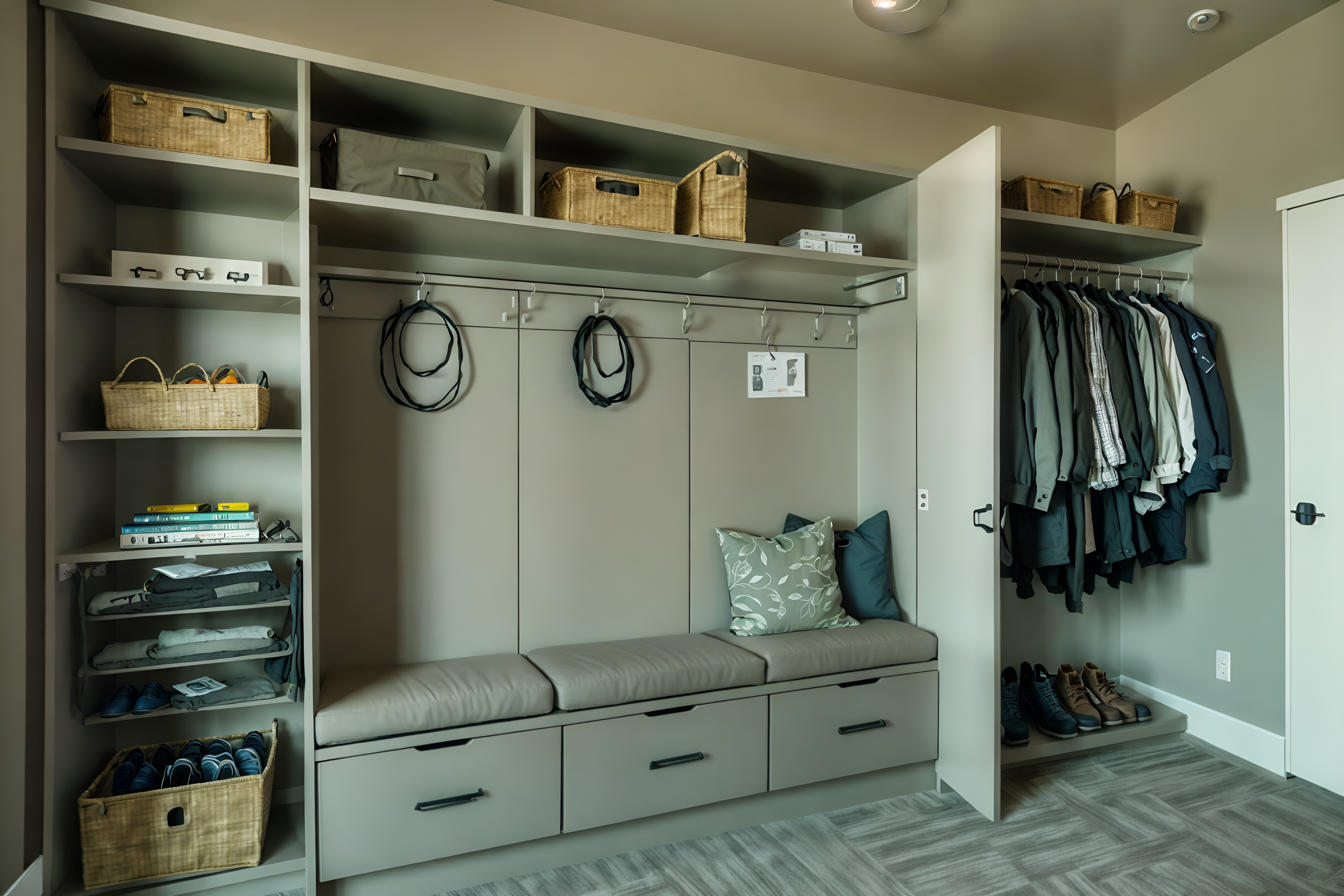 photo from pinterest of eco-friendly-style interior designed (drop zone interior) with wall hooks for coats and cabinets and a bench and shelves for shoes and cubbies and storage drawers and storage baskets and lockers cinematic photo, highly detailed, cinematic lighting, ultra-detailed, ultrarealistic, photorealism, 8k. trending on pinterest. eco-friendly interior design style. masterpiece, cinematic light, ultrarealistic+, photorealistic+, 8k, raw photo, realistic, sharp focus on eyes, (symmetrical eyes), (intact eyes), hyperrealistic, highest quality, best quality, , highly detailed, masterpiece, best quality, extremely detailed 8k wallpaper, masterpiece, best quality, ultra-detailed, best shadow, detailed background, detailed face, detailed eyes, high contrast, best illumination, detailed face, dulux, caustic, dynamic angle, detailed glow. dramatic lighting. highly detailed, insanely detailed hair, symmetrical, intricate details, professionally retouched, 8k high definition. strong bokeh. award winning photo.