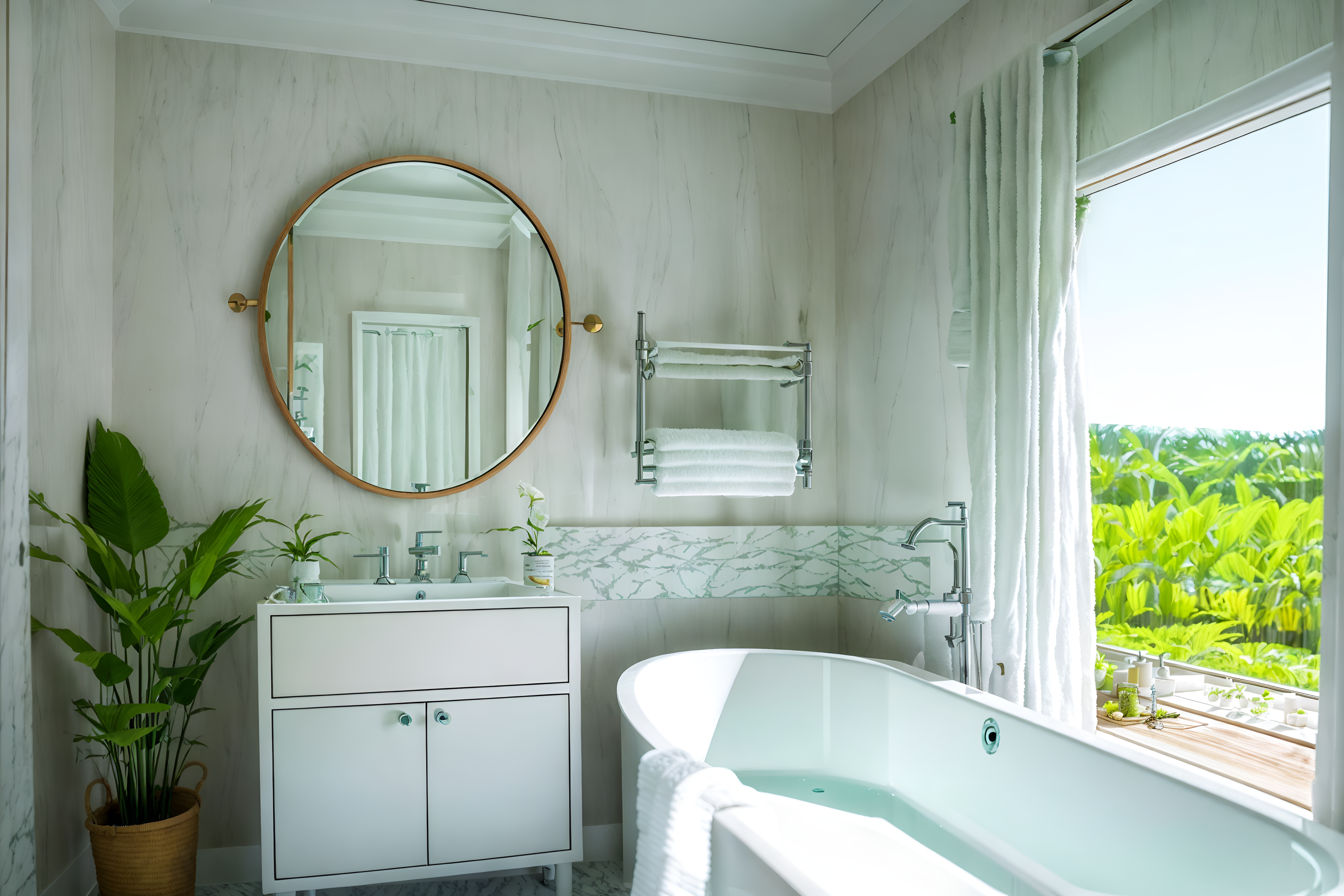 photo from pinterest of eco-friendly-style interior designed (hotel bathroom interior) with mirror and bath towel and bathroom cabinet and bath rail and plant and bathroom sink with faucet and shower and waste basket cinematic photo, highly detailed, cinematic lighting, ultra-detailed, ultrarealistic, photorealism, 8k. trending on pinterest. eco-friendly interior design style. masterpiece, cinematic light, ultrarealistic+, photorealistic+, 8k, raw photo, realistic, sharp focus on eyes, (symmetrical eyes), (intact eyes), hyperrealistic, highest quality, best quality, , highly detailed, masterpiece, best quality, extremely detailed 8k wallpaper, masterpiece, best quality, ultra-detailed, best shadow, detailed background, detailed face, detailed eyes, high contrast, best illumination, detailed face, dulux, caustic, dynamic angle, detailed glow. dramatic lighting. highly detailed, insanely detailed hair, symmetrical, intricate details, professionally retouched, 8k high definition. strong bokeh. award winning photo.