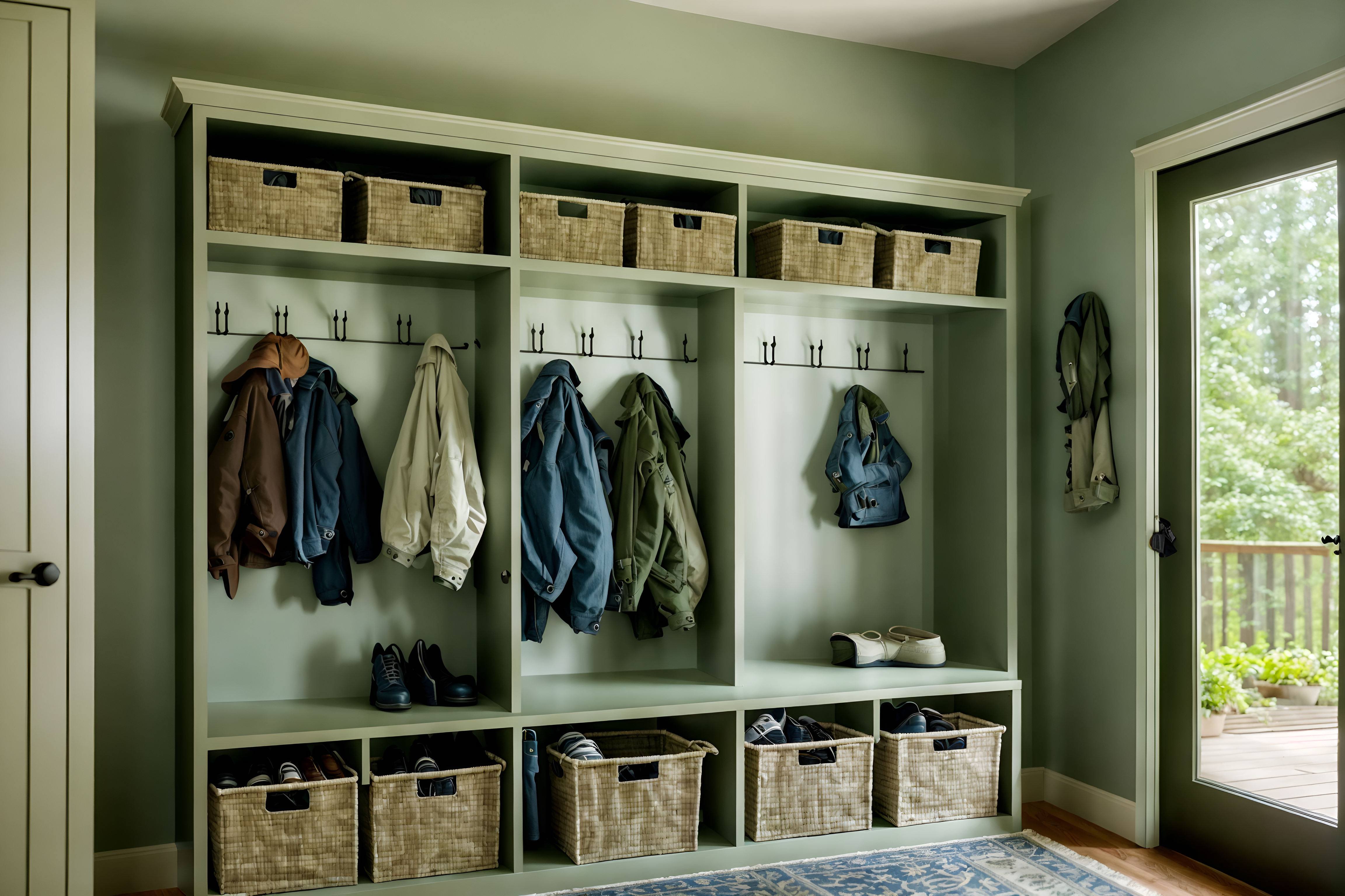 photo from pinterest of eco-friendly-style interior designed (mudroom interior) with cabinets and wall hooks for coats and storage drawers and a bench and high up storage and storage baskets and cubbies and shelves for shoes cinematic photo, highly detailed, cinematic lighting, ultra-detailed, ultrarealistic, photorealism, 8k. trending on pinterest. eco-friendly interior design style. masterpiece, cinematic light, ultrarealistic+, photorealistic+, 8k, raw photo, realistic, sharp focus on eyes, (symmetrical eyes), (intact eyes), hyperrealistic, highest quality, best quality, , highly detailed, masterpiece, best quality, extremely detailed 8k wallpaper, masterpiece, best quality, ultra-detailed, best shadow, detailed background, detailed face, detailed eyes, high contrast, best illumination, detailed face, dulux, caustic, dynamic angle, detailed glow. dramatic lighting. highly detailed, insanely detailed hair, symmetrical, intricate details, professionally retouched, 8k high definition. strong bokeh. award winning photo.