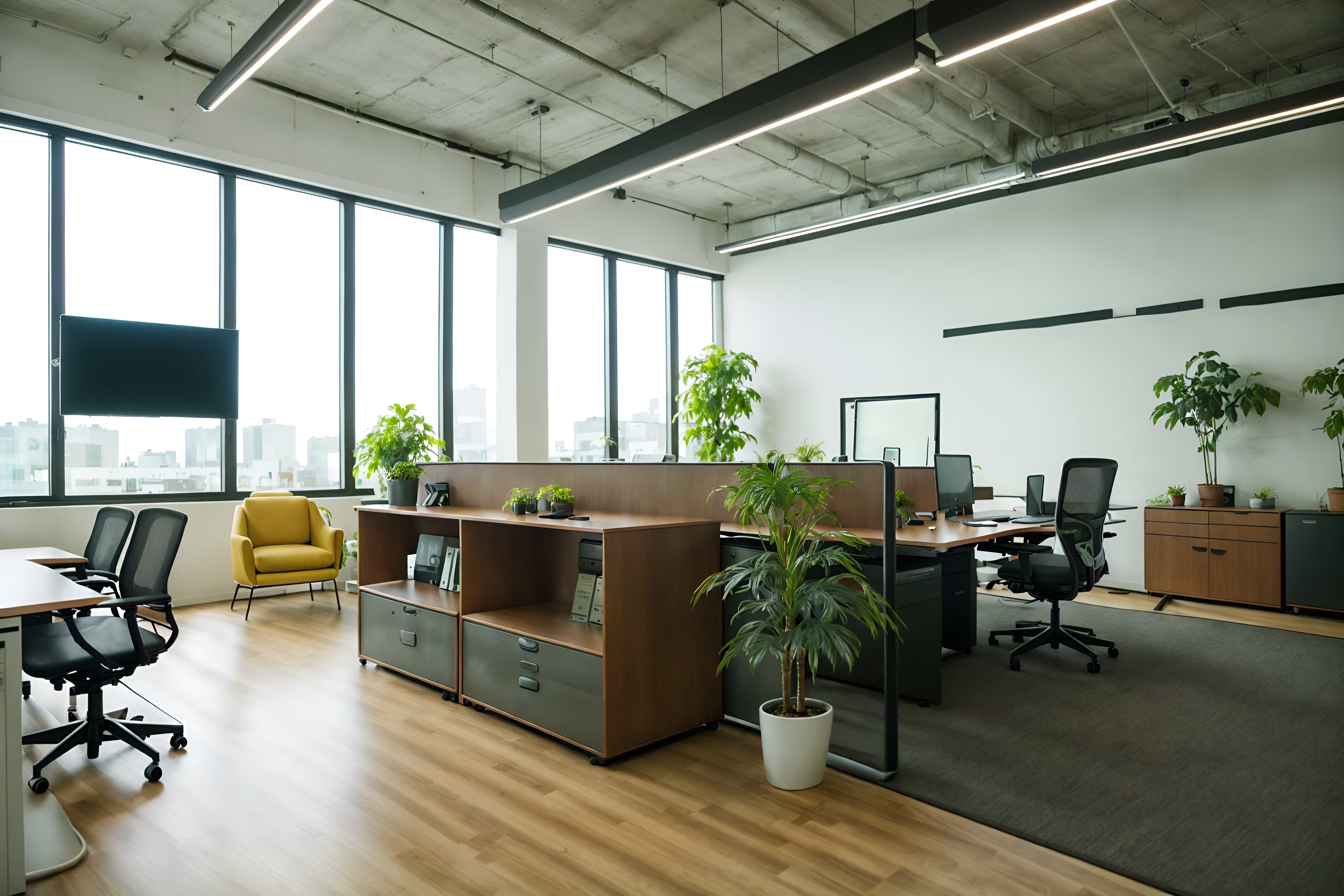 photo from pinterest of eco-friendly-style interior designed (office interior) with lounge chairs and computer desks and seating area with sofa and office chairs and office desks and desk lamps and plants and cabinets cinematic photo, highly detailed, cinematic lighting, ultra-detailed, ultrarealistic, photorealism, 8k. trending on pinterest. eco-friendly interior design style. masterpiece, cinematic light, ultrarealistic+, photorealistic+, 8k, raw photo, realistic, sharp focus on eyes, (symmetrical eyes), (intact eyes), hyperrealistic, highest quality, best quality, , highly detailed, masterpiece, best quality, extremely detailed 8k wallpaper, masterpiece, best quality, ultra-detailed, best shadow, detailed background, detailed face, detailed eyes, high contrast, best illumination, detailed face, dulux, caustic, dynamic angle, detailed glow. dramatic lighting. highly detailed, insanely detailed hair, symmetrical, intricate details, professionally retouched, 8k high definition. strong bokeh. award winning photo.