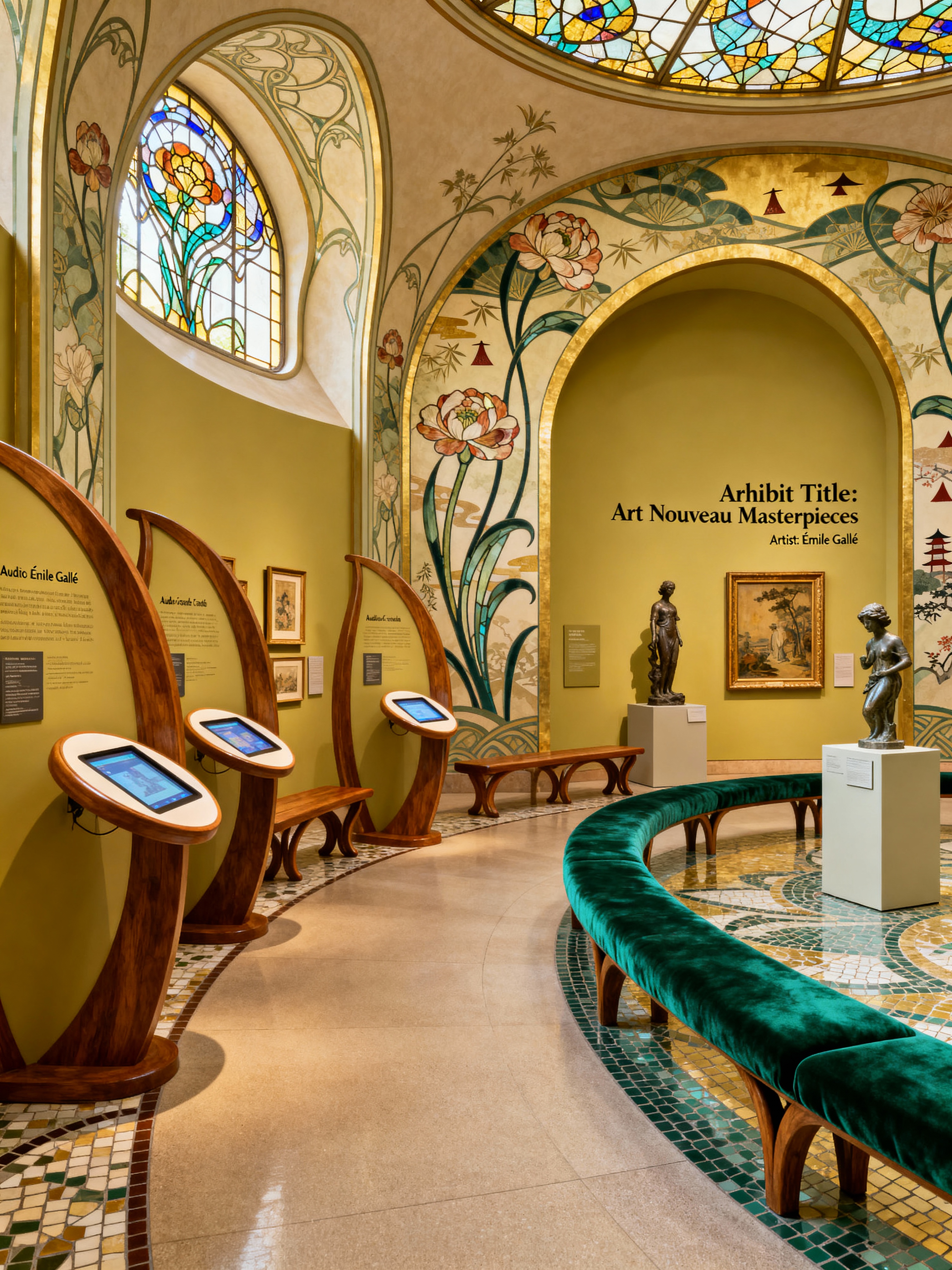 exhibition space with art nouveau style with audio guides and barriers and benches and artwork and pedestals and interactive displays and sculptures and information plaques. . with arches and curved forms and asymmetrical shapes and stained glass and wallpaper patterns of stylized flowers and stained glass and japanese motifs and soft, rounded lines and mosaics