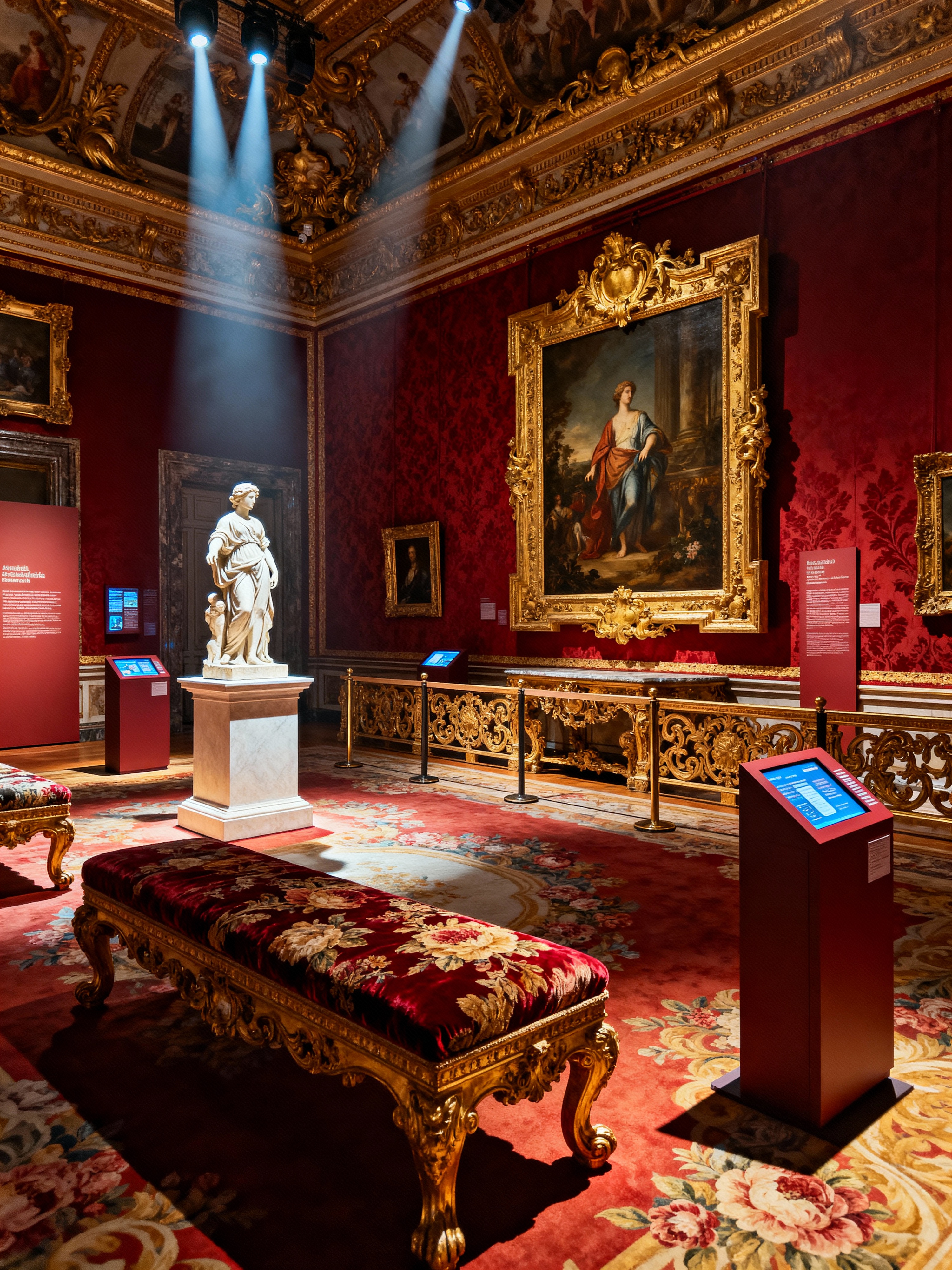 exhibition space with baroque style with spotlights and sculptures and benches and interactive displays and pedestals and audio guides and artwork and barriers. . with dynamism and sensuous richness and opulent and colossal furniture and drama and elaborate ornamentation and heavy moldings and pedestal feet and luxurious floral and damask fabrics