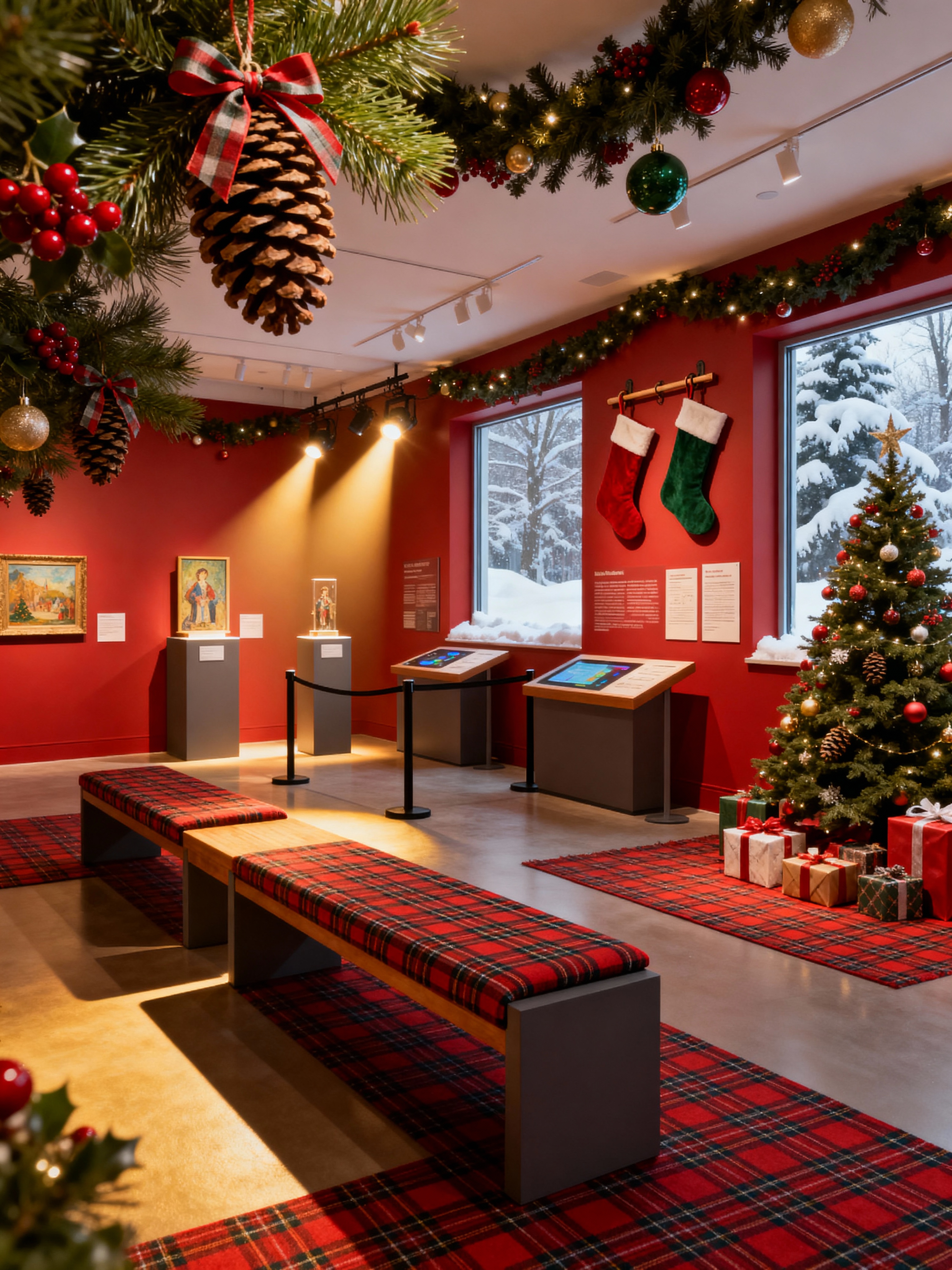 exhibition space with christmas style with benches and spotlights and information plaques and artwork and pedestals and barriers and interactive displays and display cases. . with tie pinecones and berries and snow outside and giftwrapped gifts and plaid rugs and christmas ornaments and ribbons and a few big socks hanging and berries and greenery draped