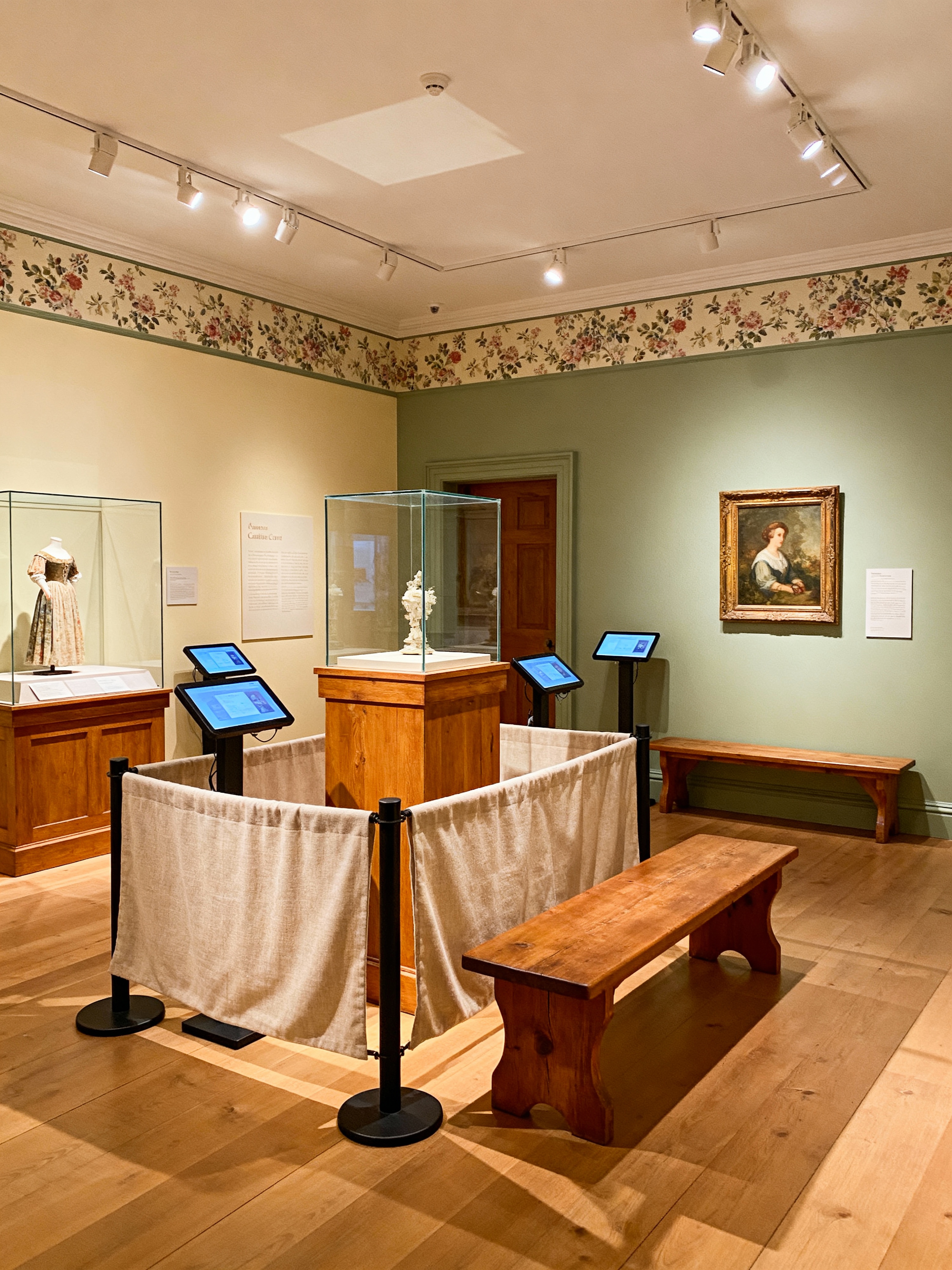 exhibition space with cottagecore style with pedestals and barriers and spotlights and display cases and audio guides and interactive displays and benches and artwork. . with rustic and floral patterns and earthy and traditional and natural and organic and country style and muted colors