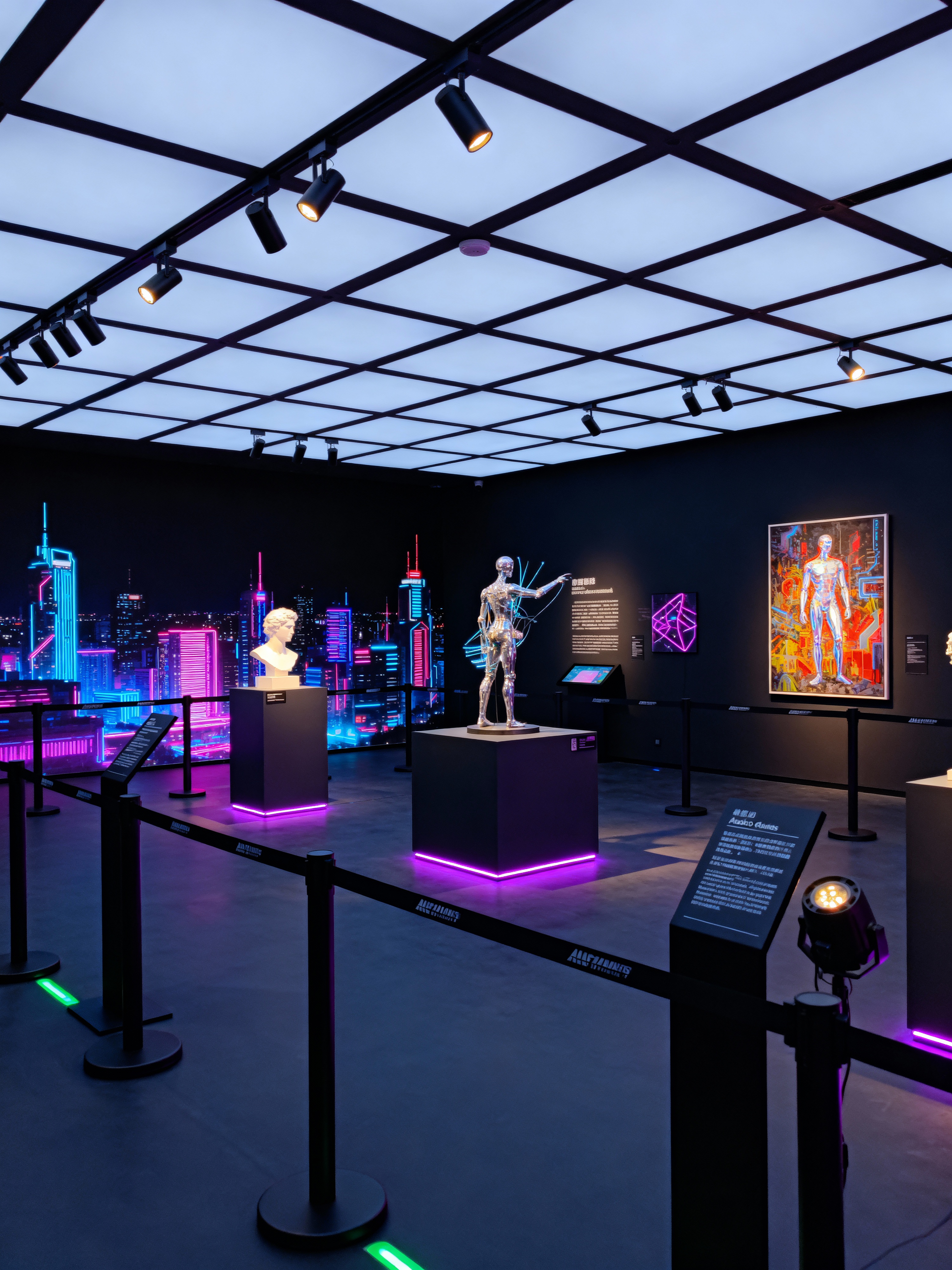 exhibition space with cyberpunk style with barriers and spotlights and sculptures and artwork and pedestals and audio guides and interactive displays and information plaques. . with cyberpunk lights and futuristic cybernetic city and clean straight square lines and dark night and led lights and synthetic objects and cyberpunk lights and futuristic cybernetic details