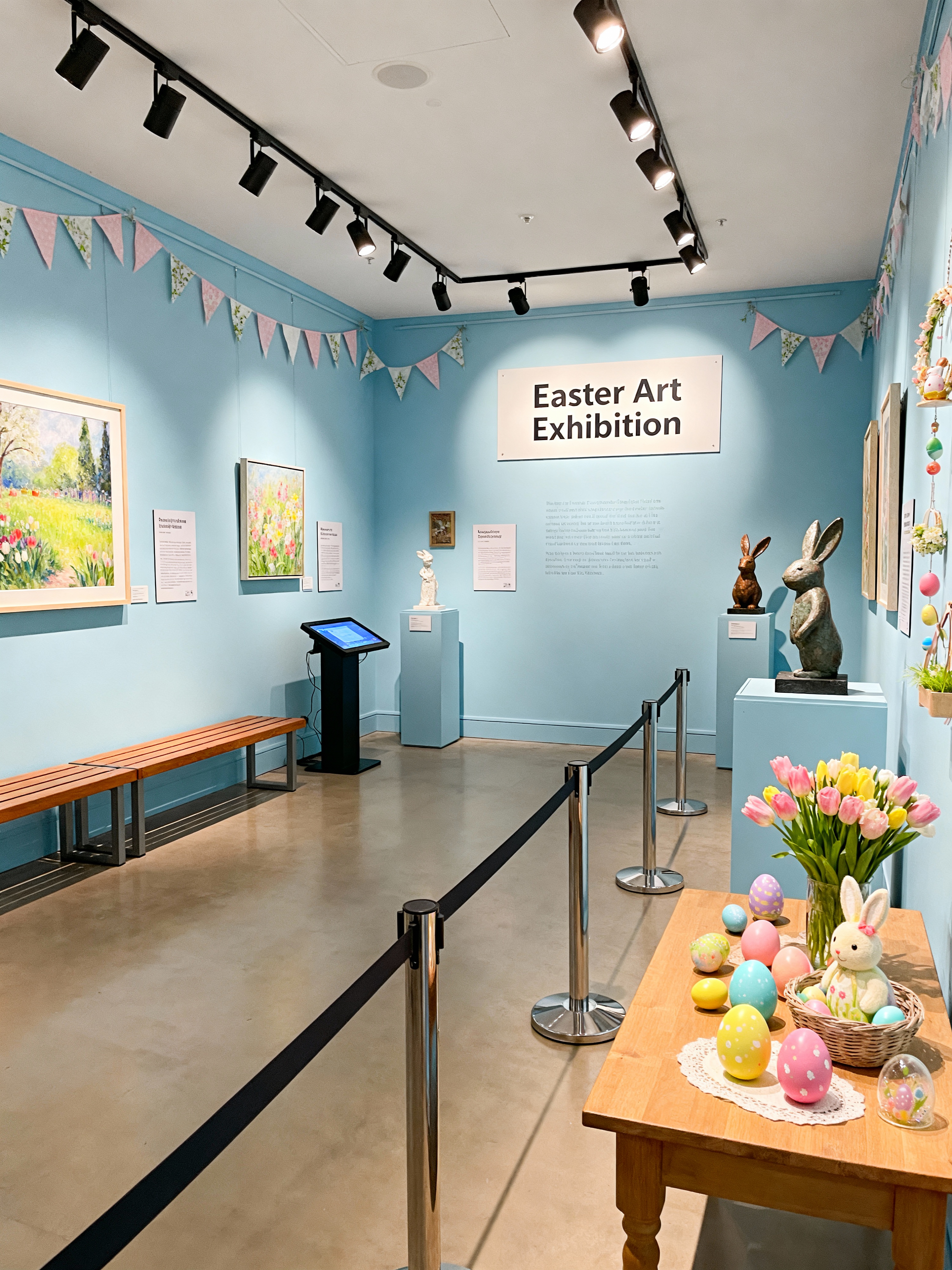 exhibition space with easter style with artwork and information plaques and spotlights and benches and interactive displays and sculptures and barriers and pedestals. . with light blue colors and spring decorations and colorful easter eggs and easter decorations and flowers on table and light blue colors