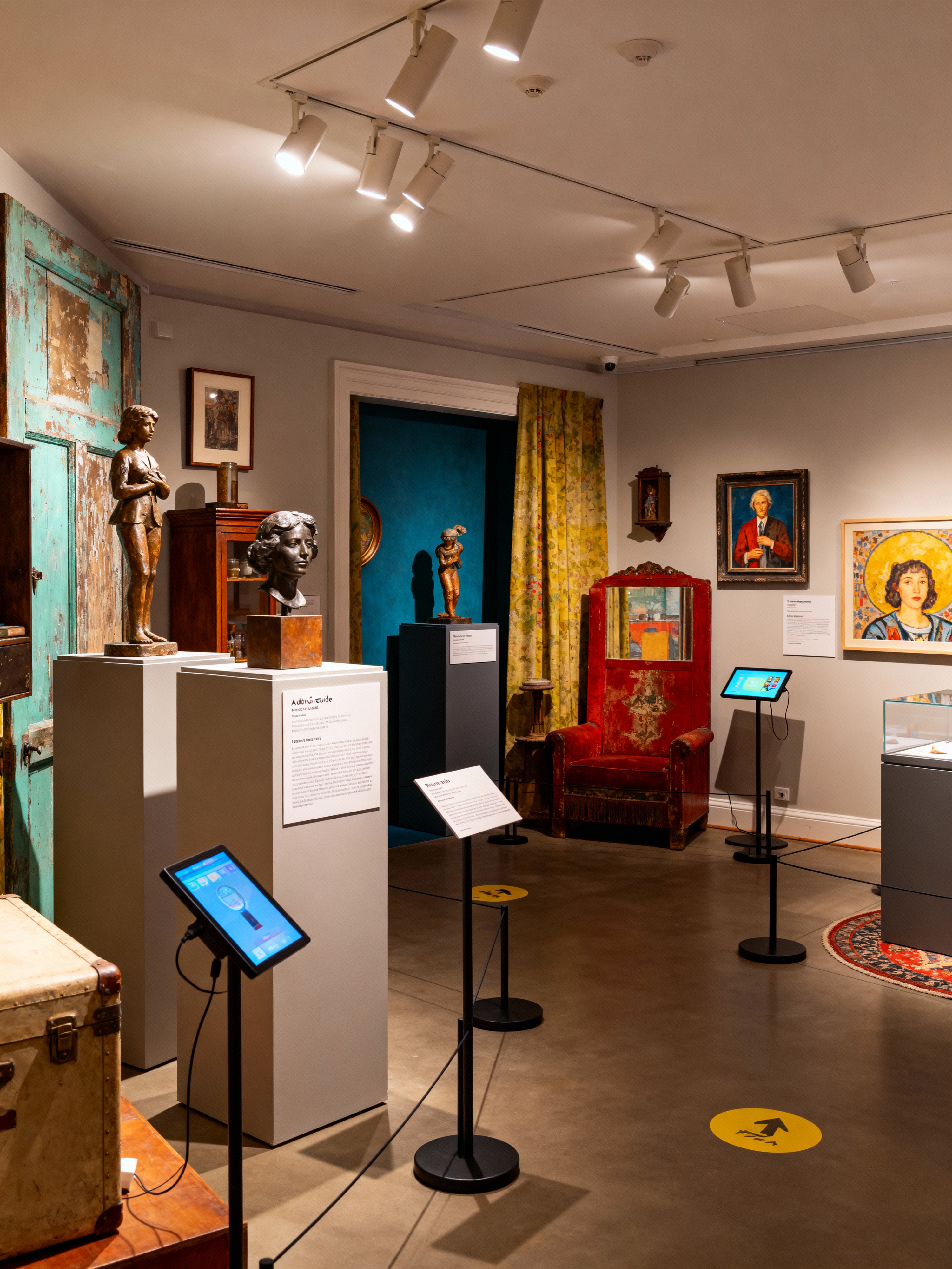 exhibition space with eclectic style with information plaques and audio guides and sculptures and spotlights and barriers and pedestals and interactive displays and artwork. . with artistic flair and layered textures and unique pieces and vintage finds and personal expression and creative freedom and colorful palette and mixed styles