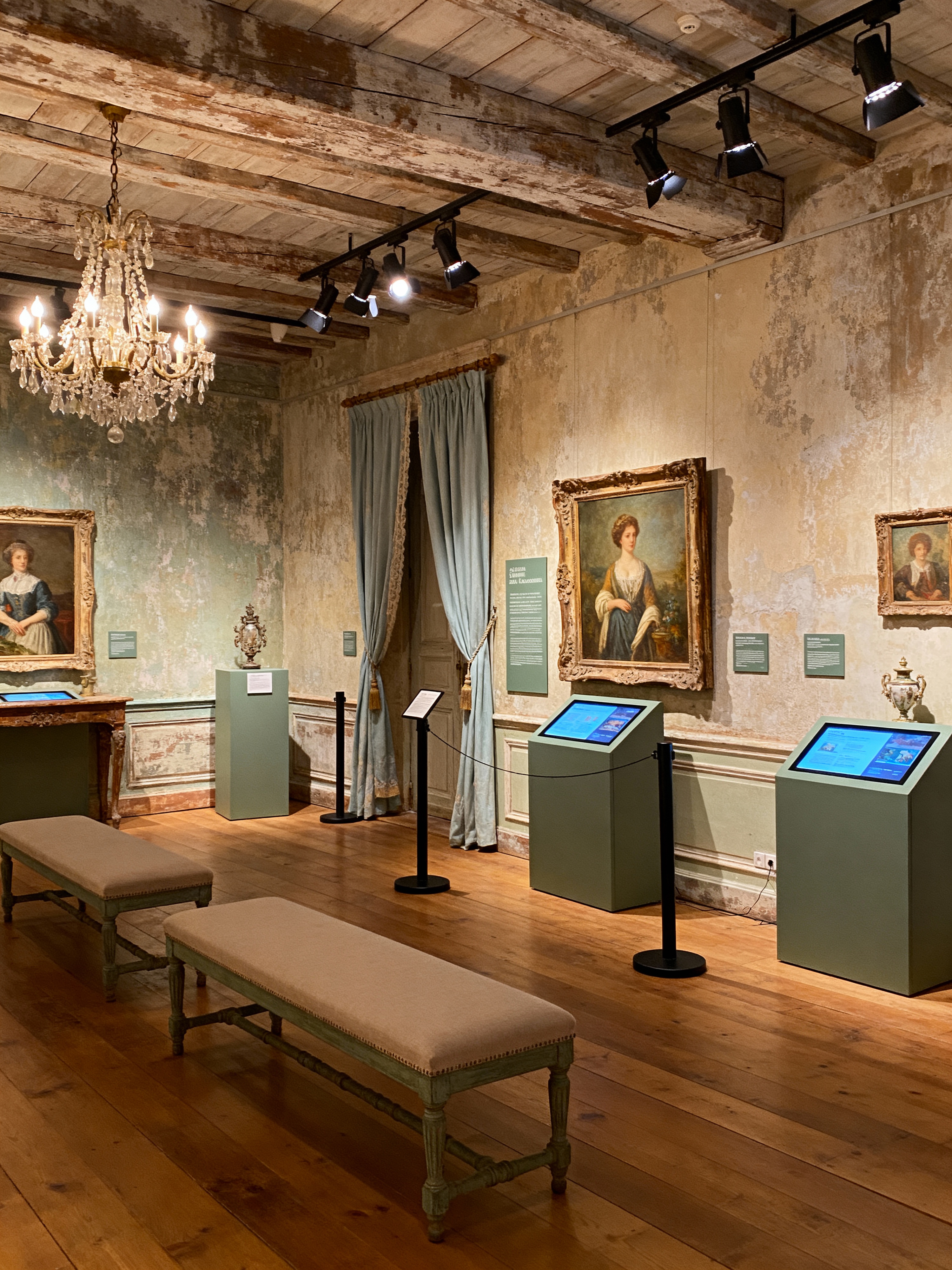 exhibition space with french country style with benches and interactive displays and audio guides and pedestals and barriers and spotlights and artwork and information plaques. . with antique decor and ornate details and country elegance and distressed wood and textured walls and chandeliers and soft fabrics and elegant rustic