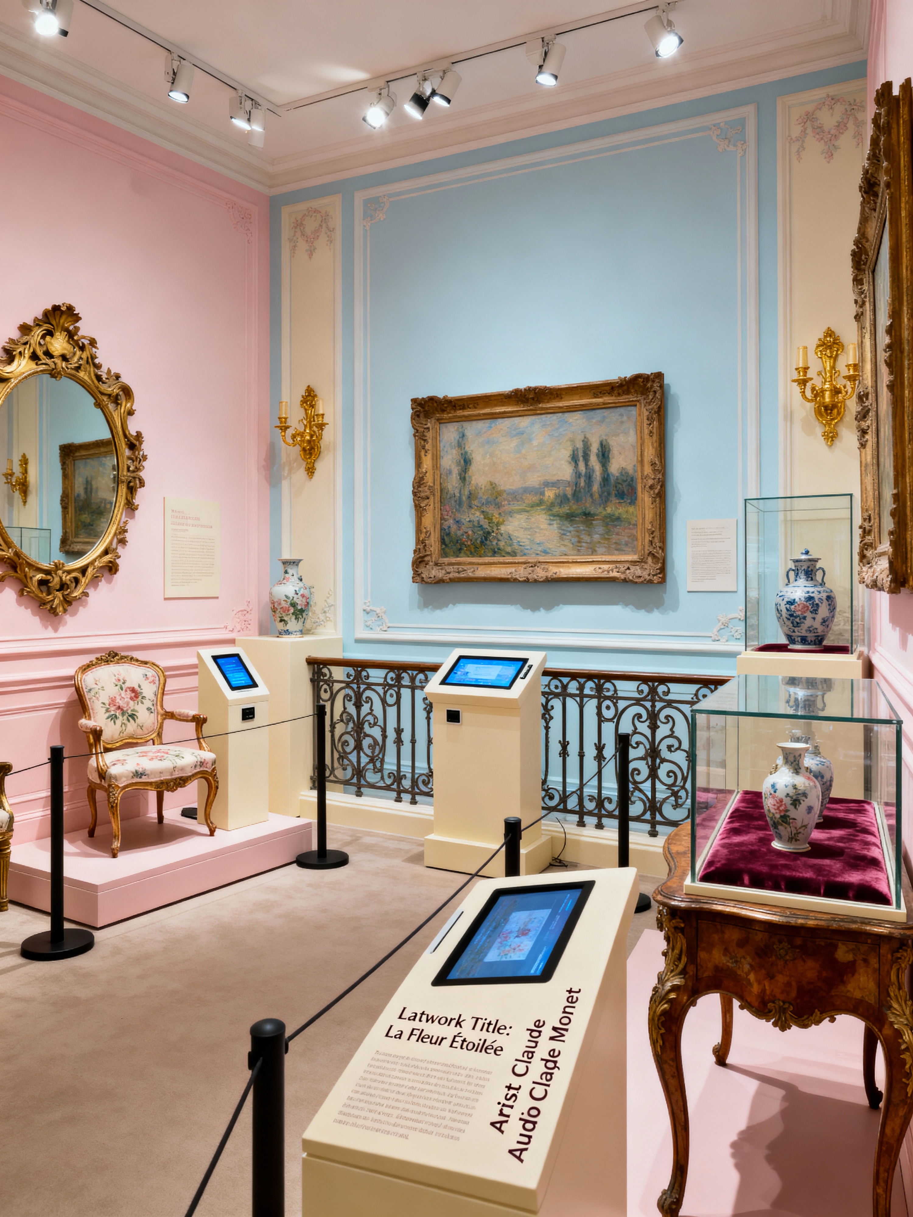 exhibition space with french style with pedestals and audio guides and interactive displays and information plaques and artwork and barriers and spotlights and display cases. . with ornate furniture and soft pastels and provincial charm and classic beauty and romantic style and elegant details and refined luxury and antique pieces
