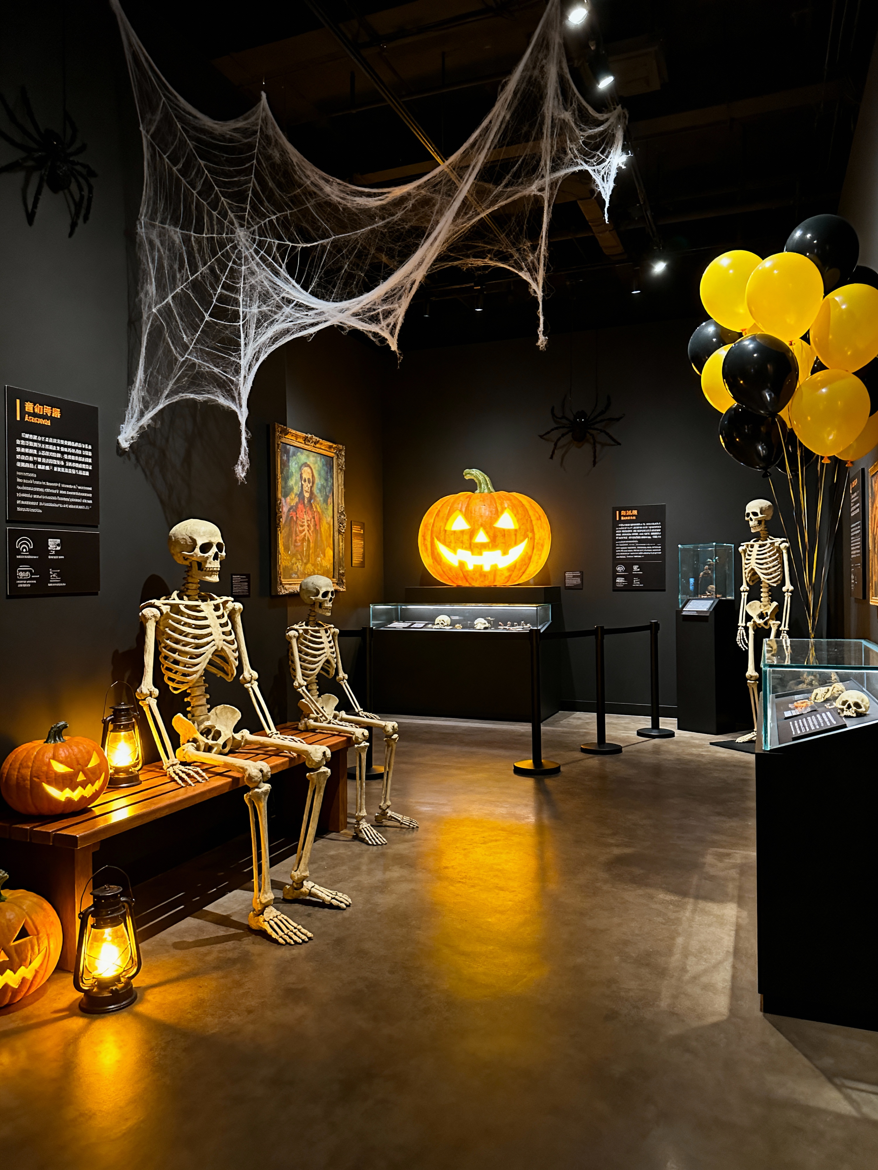 exhibition space with halloween style with information plaques and benches and display cases and audio guides and barriers and interactive displays and sculptures and artwork. . with human skulls and cobwebs and skeletons sitting and standing and lanterns and spiderwebs and glowing pumpkins and yellow black balloons and lanterns