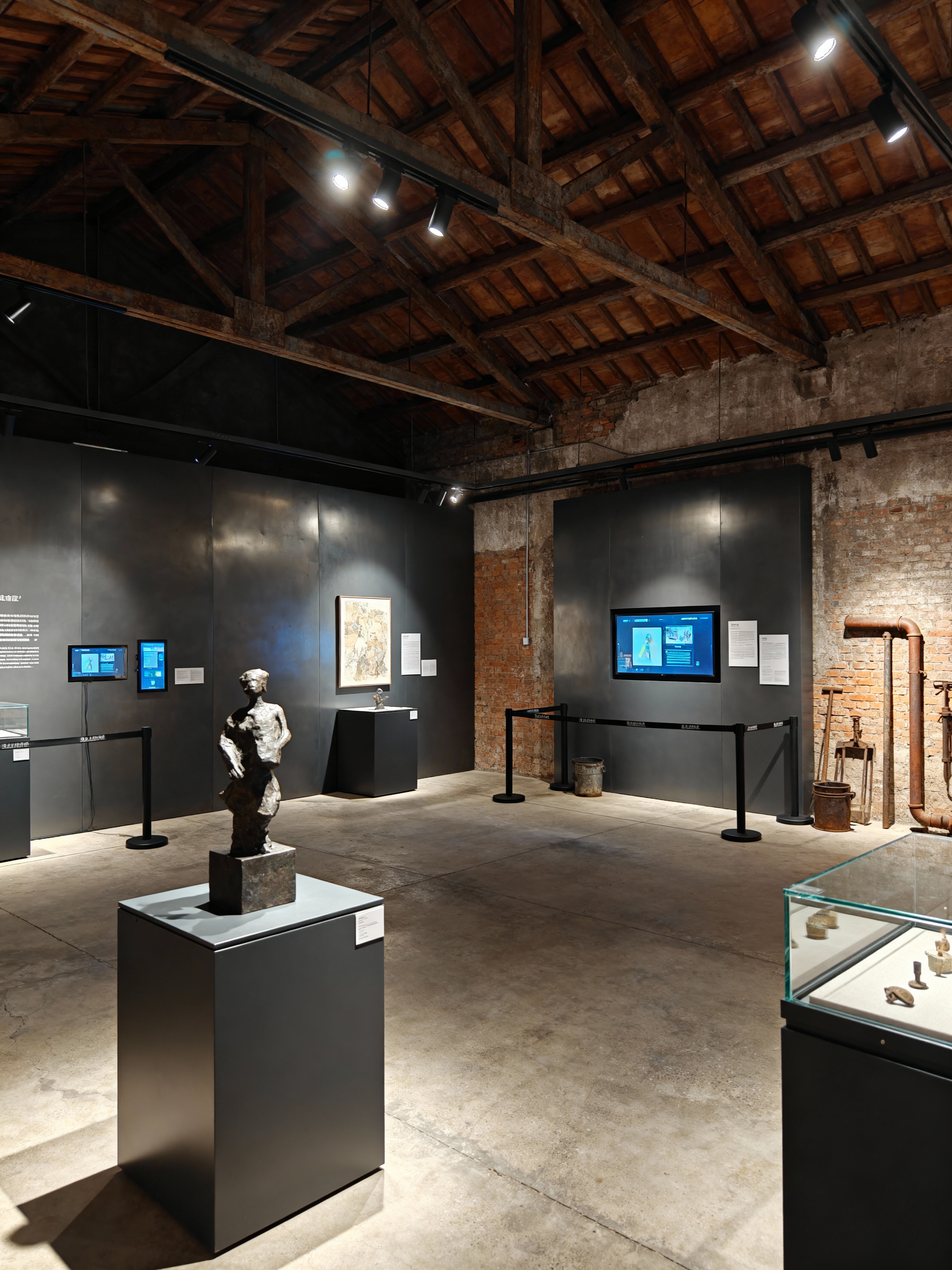 exhibition space with industrial style with pedestals and spotlights and sculptures and interactive displays and artwork and information plaques and barriers and display cases. . with exposed rafters and open floorplan and exposed brick and factory style and metal panels and neutral tones and raw aesthetic and utilitarian objects