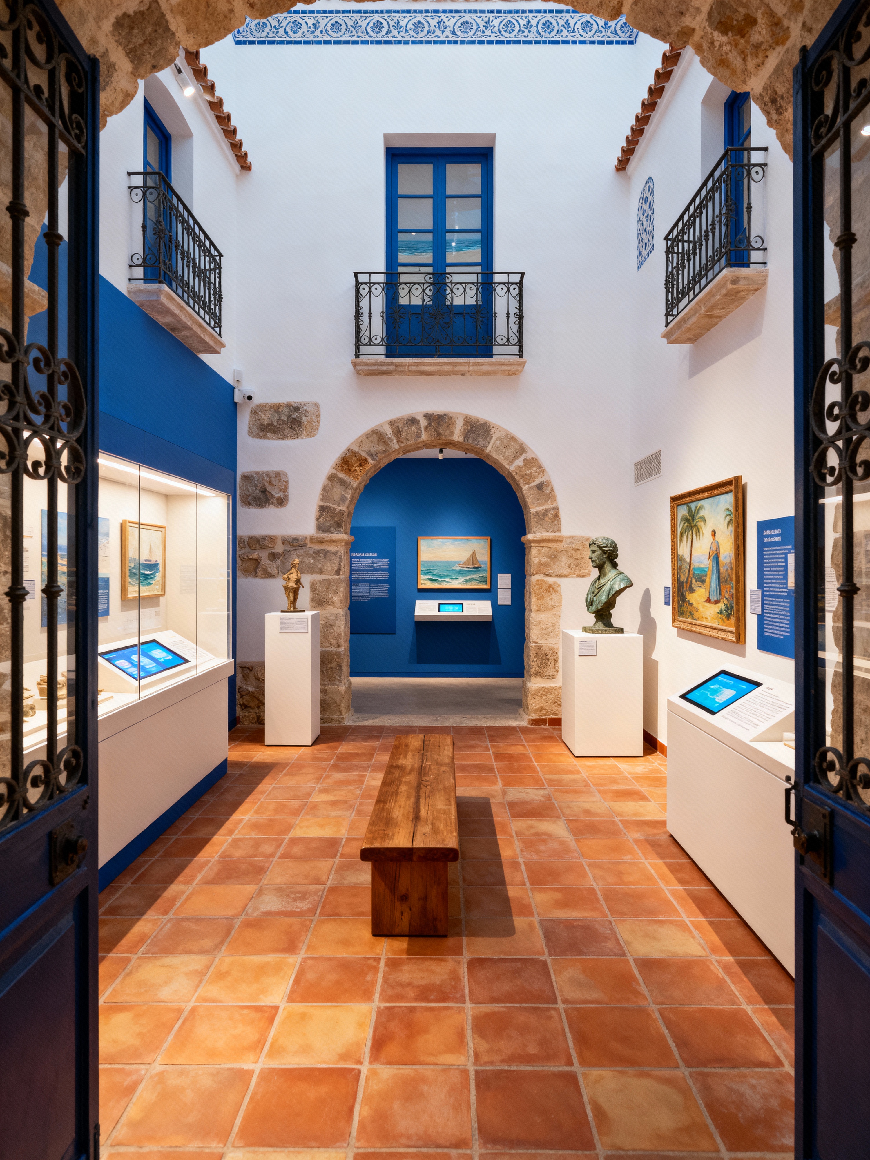 exhibition space with mediterranean style with display cases and interactive displays and artwork and sculptures and audio guides and information plaques and benches and pedestals. . with stone accents and rustic charm and warm earth tones and wrought iron and terracotta tiles and coastal influence and arched doorways and blue and white