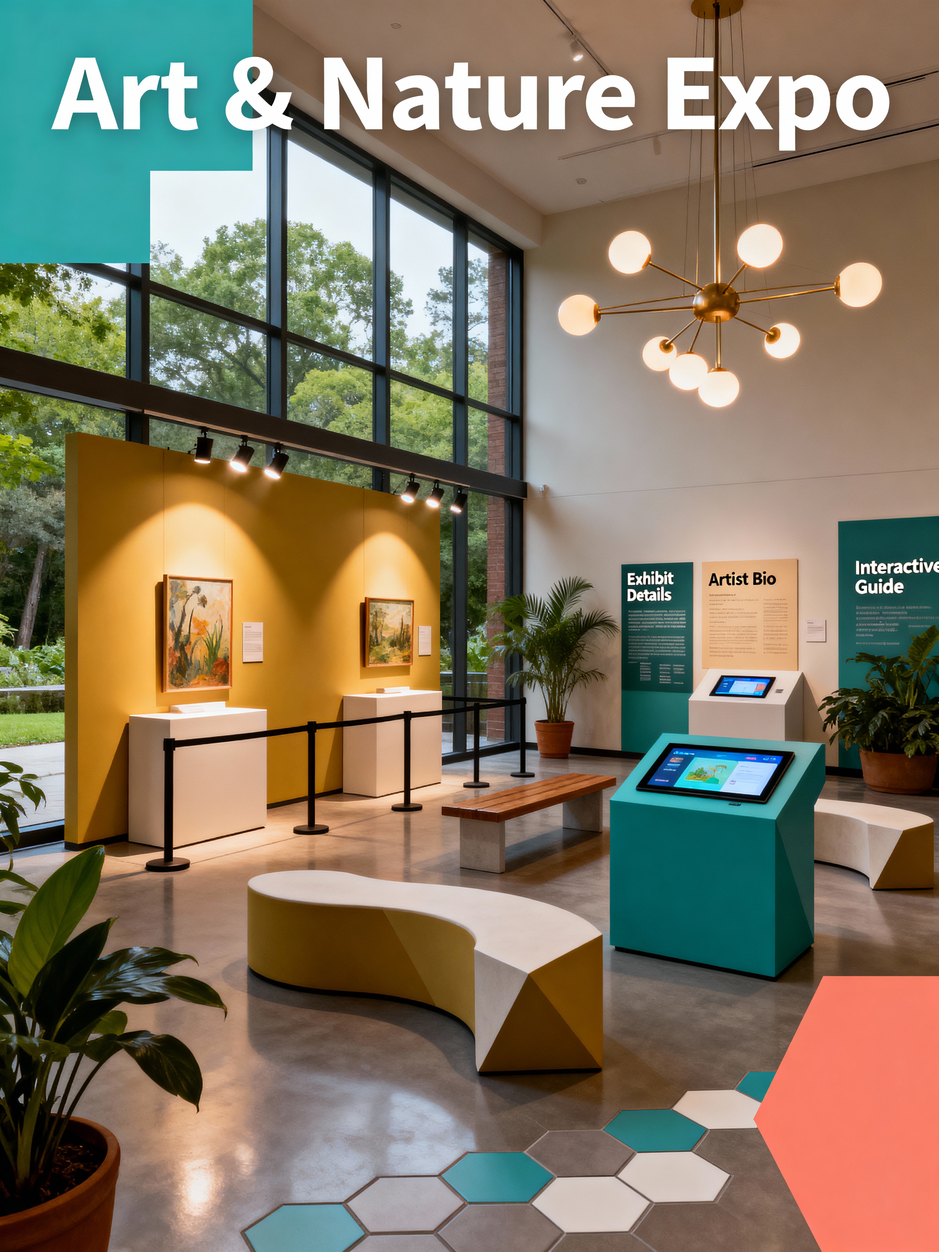 exhibition space with midcentury modern style with spotlights and barriers and pedestals and audio guides and benches and interactive displays and information plaques and artwork. . with integrating indoor and outdoor motifs and vibrant colors and nature indoors and graphic shapes and clean lines and function over form and mid century modern mobile chandelier and organic and geometric shapes
