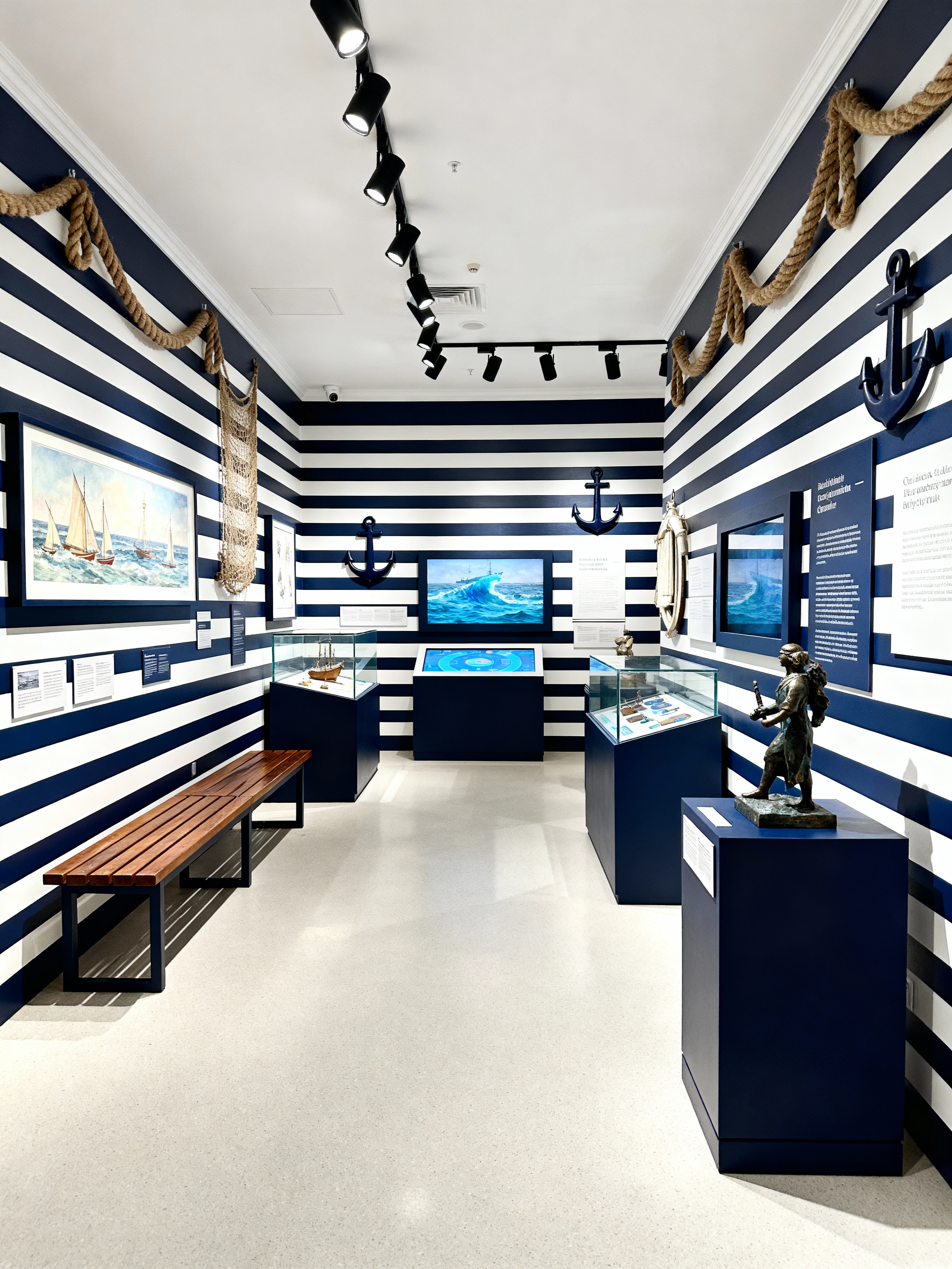 exhibition space with nautical style with spotlights and benches and display cases and interactive displays and artwork and information plaques and pedestals and sculptures. . with navy blue and ocean inspiration and crisp white and striped patterns and rope details and maritime decor and anchor motifs and coastal vibes