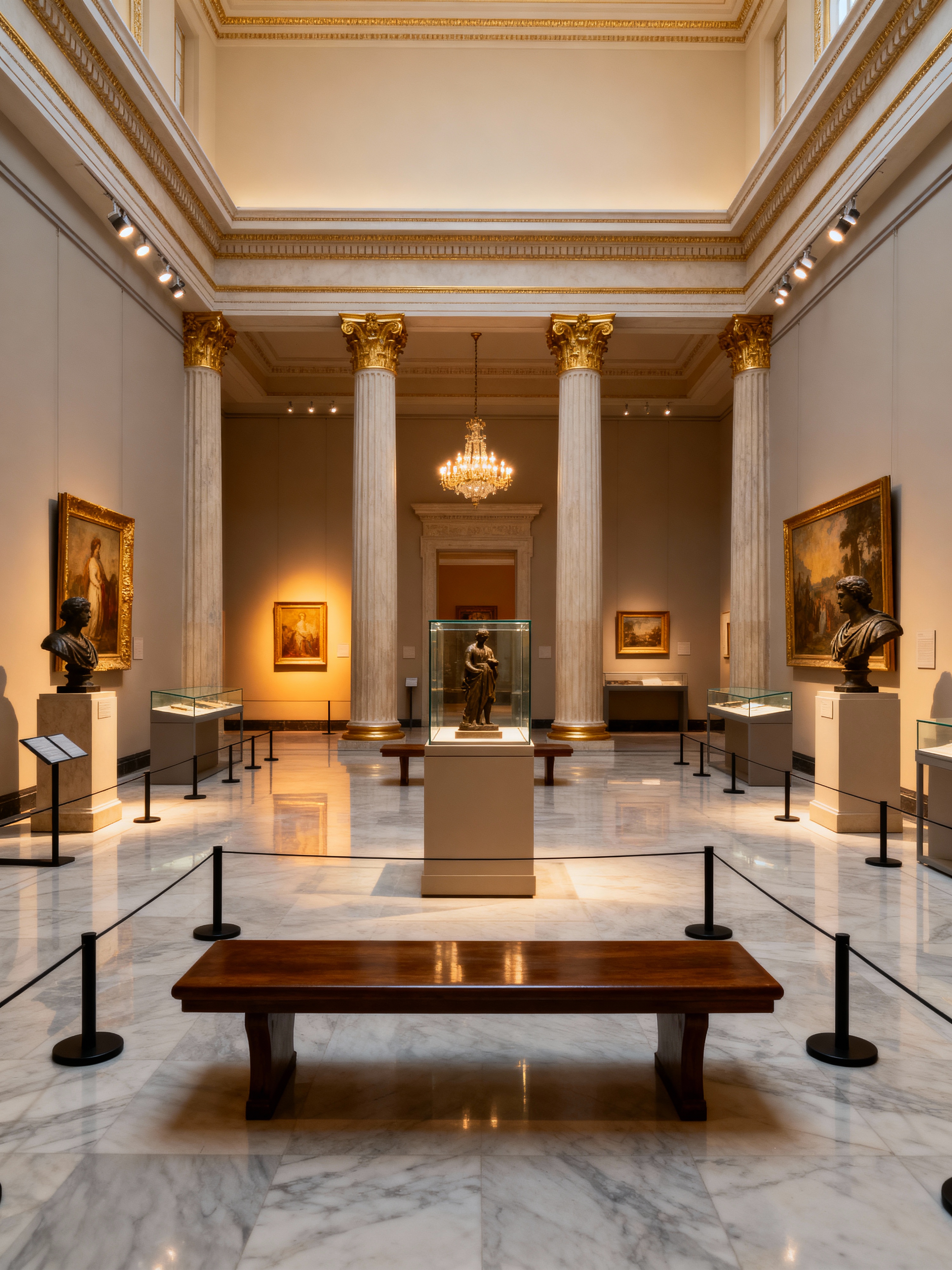 exhibition space with neoclassic style with audio guides and spotlights and barriers and benches and pedestals and artwork and sculptures and display cases. . with timeless furniture and elegant and sophisticated and spacious rooms and classical architectural details and high ceilings and symmetric layouts and emphasized horizontal and vertical lines and greek columns