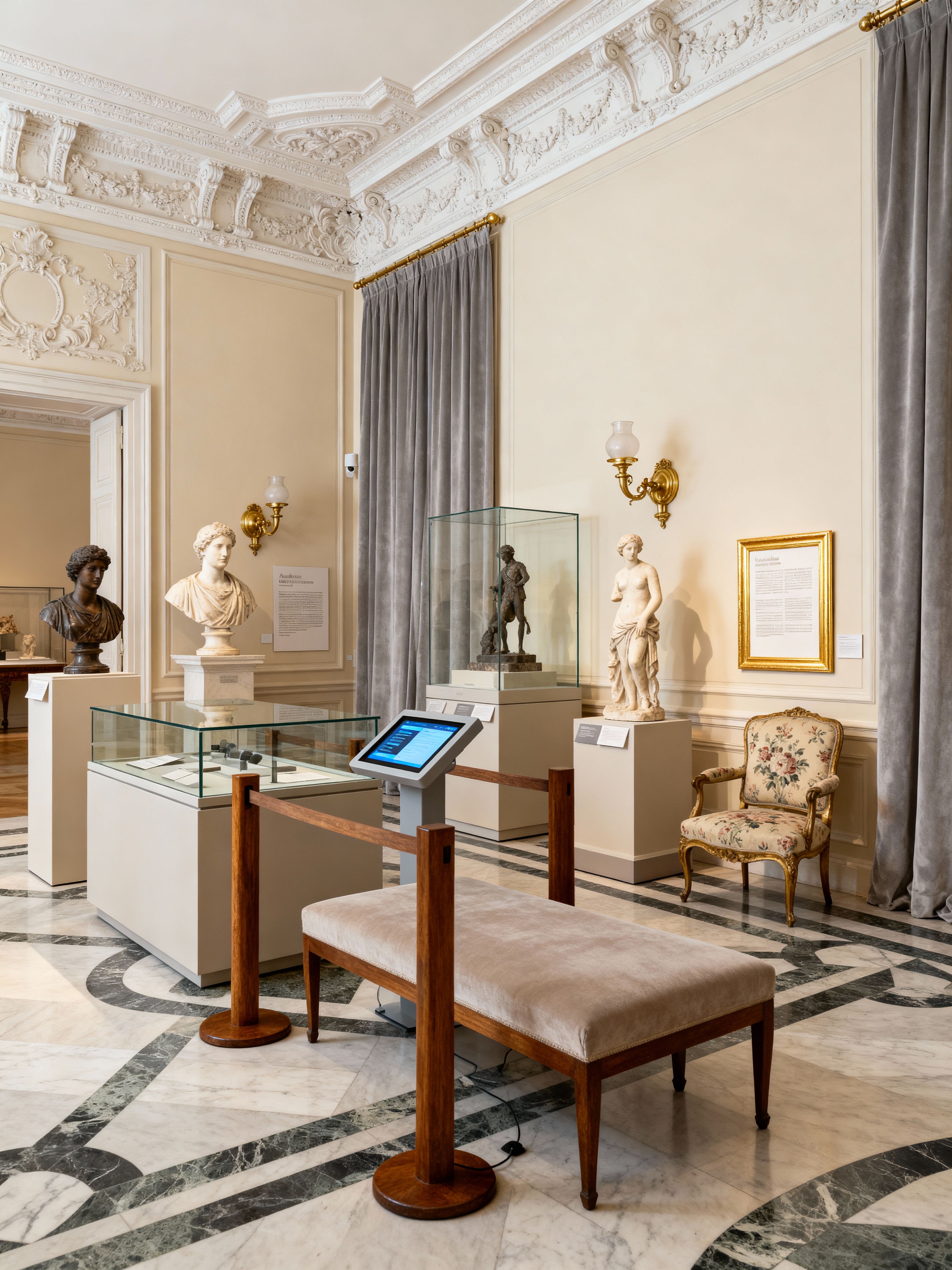 exhibition space with parisian style with sculptures and display cases and barriers and audio guides and benches and pedestals and interactive displays and information plaques. . with refined style and classic details and chic simplicity and neutral palette and vintage pieces and european flair and ornate moldings and antique furniture
