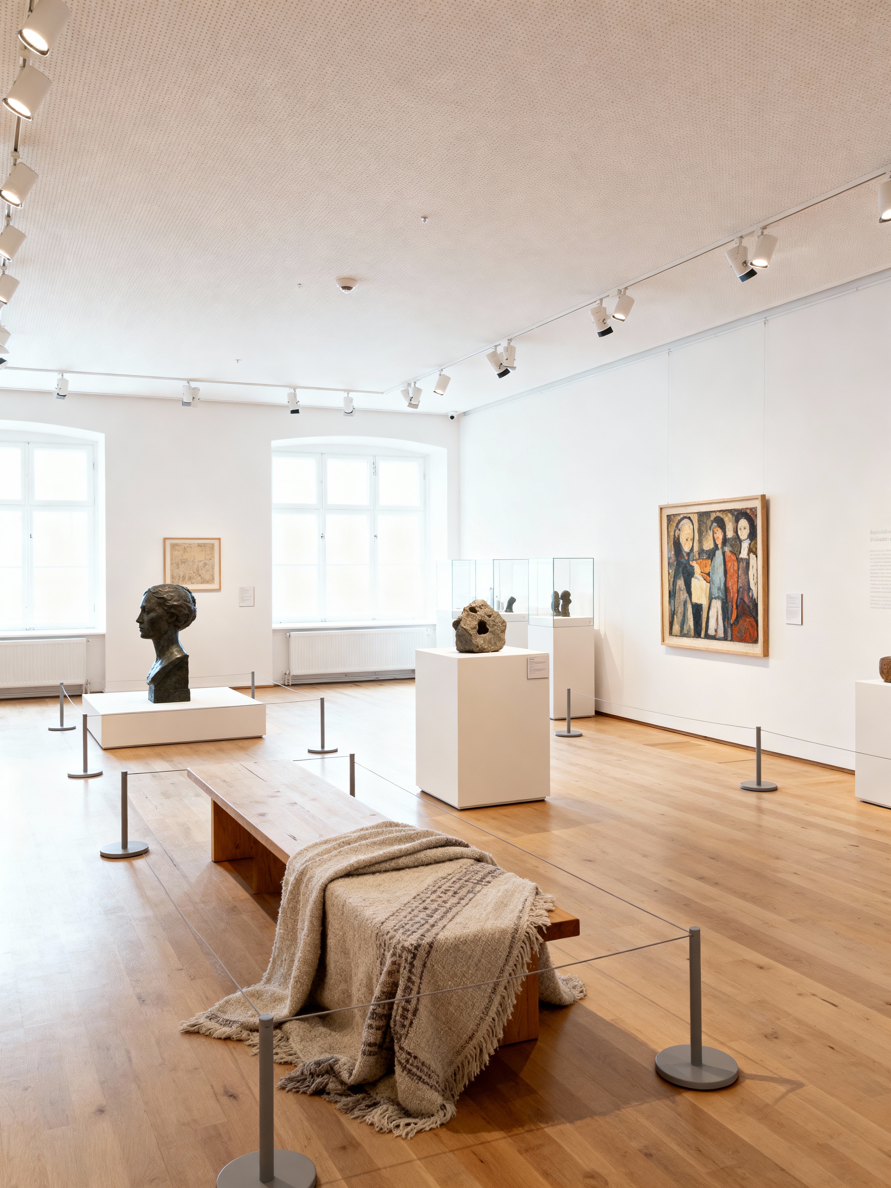 exhibition space with scandinavian style with audio guides and benches and sculptures and artwork and display cases and pedestals and spotlights and barriers. . with textured fabrics and white decor and clean lines and cozy atmosphere and natural light and light wood and functional furniture and neutral palette