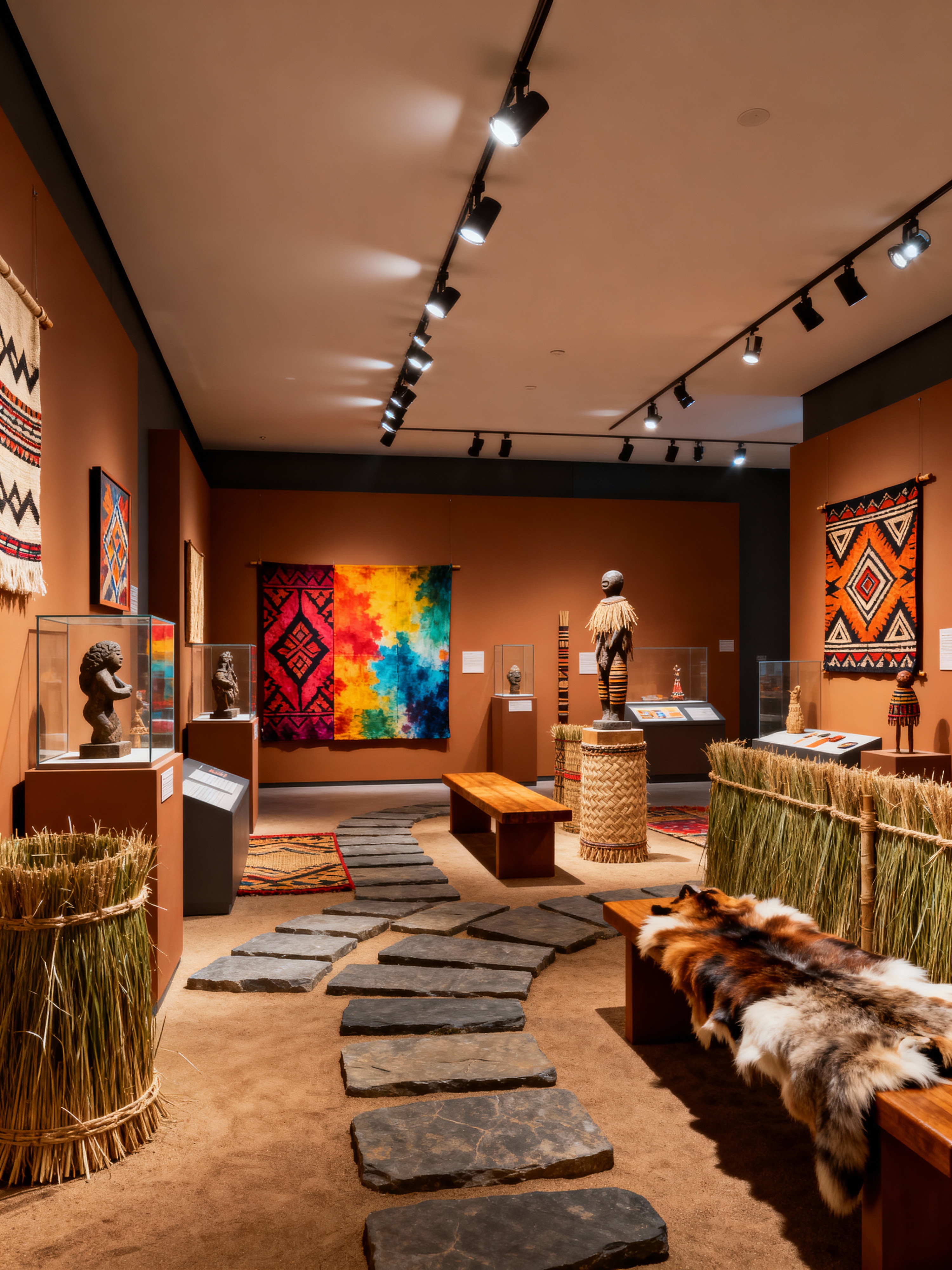 exhibition space with tribal style with pedestals and barriers and display cases and sculptures and spotlights and artwork and benches and interactive displays. . with sculptures and artworks and animal furslinen and tribal revival and intricate grass weaving and planks of stone and hand dyed batik fabrics and tribal patterns and exuberant splashes of colour