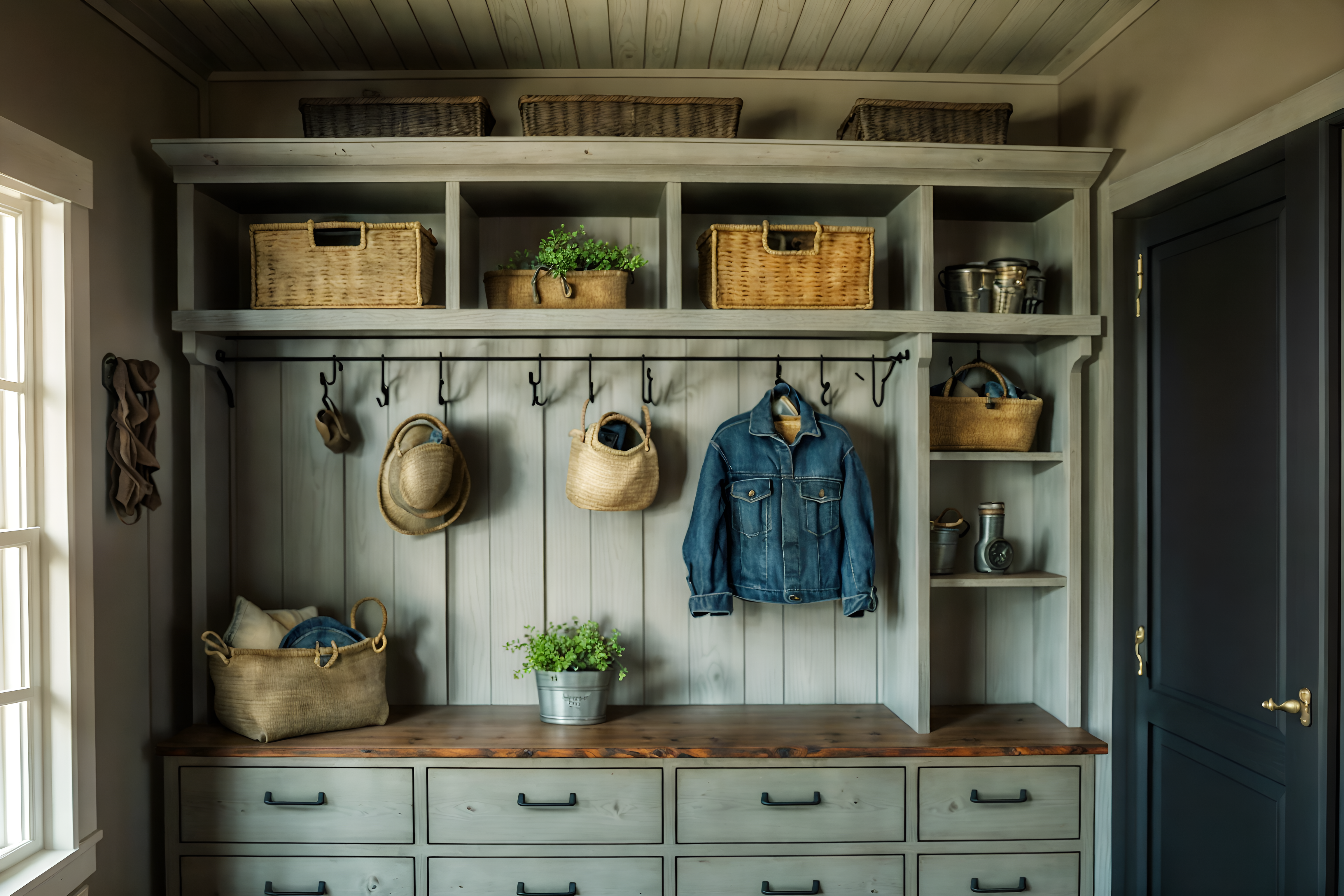 photo from pinterest of farmhouse-style interior designed (drop zone interior) with storage drawers and high up storage and wall hooks for coats and storage baskets and cabinets and shelves for shoes and cubbies and lockers. . with . . cinematic photo, highly detailed, cinematic lighting, ultra-detailed, ultrarealistic, photorealism, 8k. trending on pinterest. farmhouse interior design style. masterpiece, cinematic light, ultrarealistic+, photorealistic+, 8k, raw photo, realistic, sharp focus on eyes, (symmetrical eyes), (intact eyes), hyperrealistic, highest quality, best quality, , highly detailed, masterpiece, best quality, extremely detailed 8k wallpaper, masterpiece, best quality, ultra-detailed, best shadow, detailed background, detailed face, detailed eyes, high contrast, best illumination, detailed face, dulux, caustic, dynamic angle, detailed glow. dramatic lighting. highly detailed, insanely detailed hair, symmetrical, intricate details, professionally retouched, 8k high definition. strong bokeh. award winning photo.