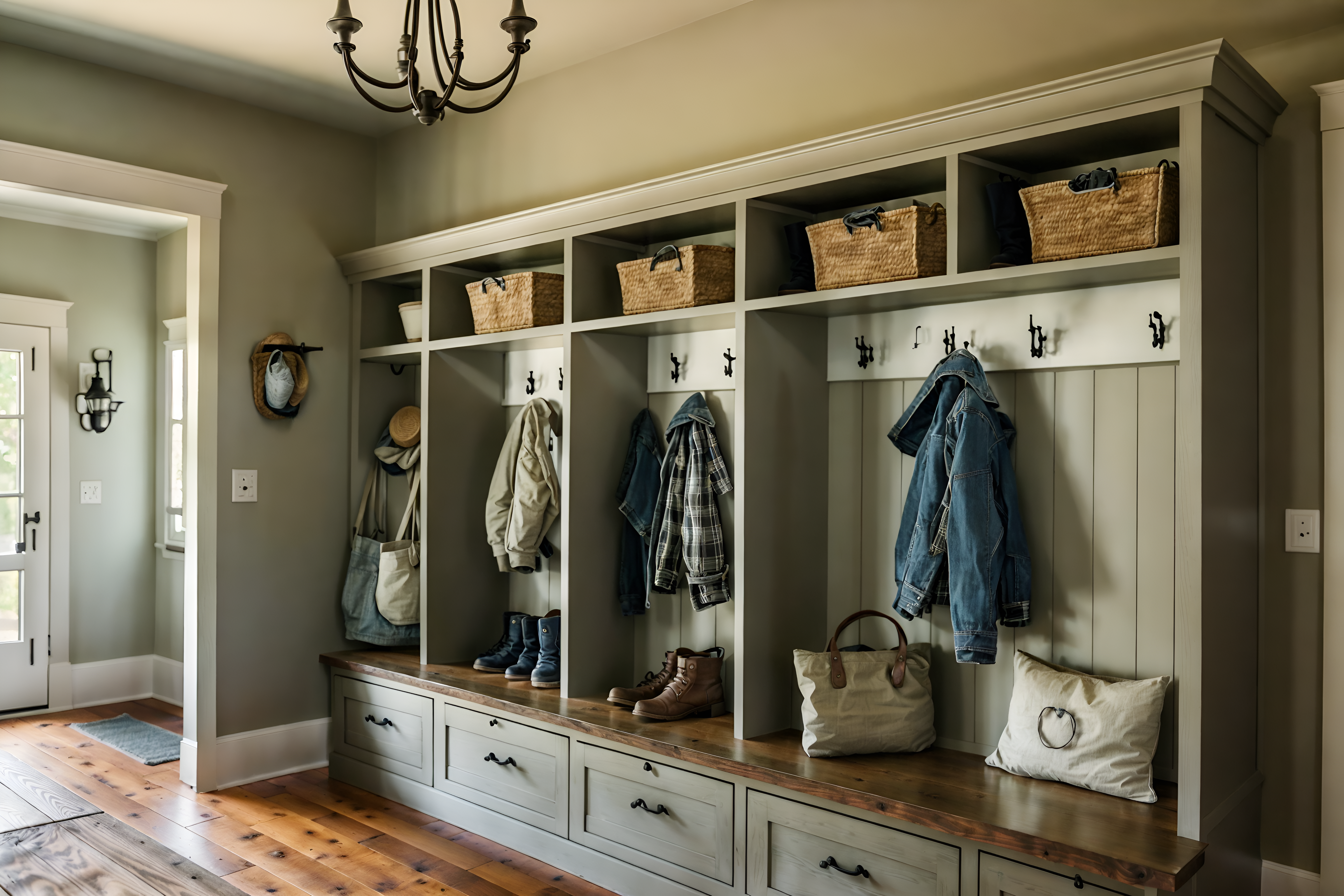 photo from pinterest of farmhouse-style interior designed (mudroom interior) with a bench and storage drawers and cubbies and shelves for shoes and wall hooks for coats and high up storage and storage baskets and cabinets. . with . . cinematic photo, highly detailed, cinematic lighting, ultra-detailed, ultrarealistic, photorealism, 8k. trending on pinterest. farmhouse interior design style. masterpiece, cinematic light, ultrarealistic+, photorealistic+, 8k, raw photo, realistic, sharp focus on eyes, (symmetrical eyes), (intact eyes), hyperrealistic, highest quality, best quality, , highly detailed, masterpiece, best quality, extremely detailed 8k wallpaper, masterpiece, best quality, ultra-detailed, best shadow, detailed background, detailed face, detailed eyes, high contrast, best illumination, detailed face, dulux, caustic, dynamic angle, detailed glow. dramatic lighting. highly detailed, insanely detailed hair, symmetrical, intricate details, professionally retouched, 8k high definition. strong bokeh. award winning photo.