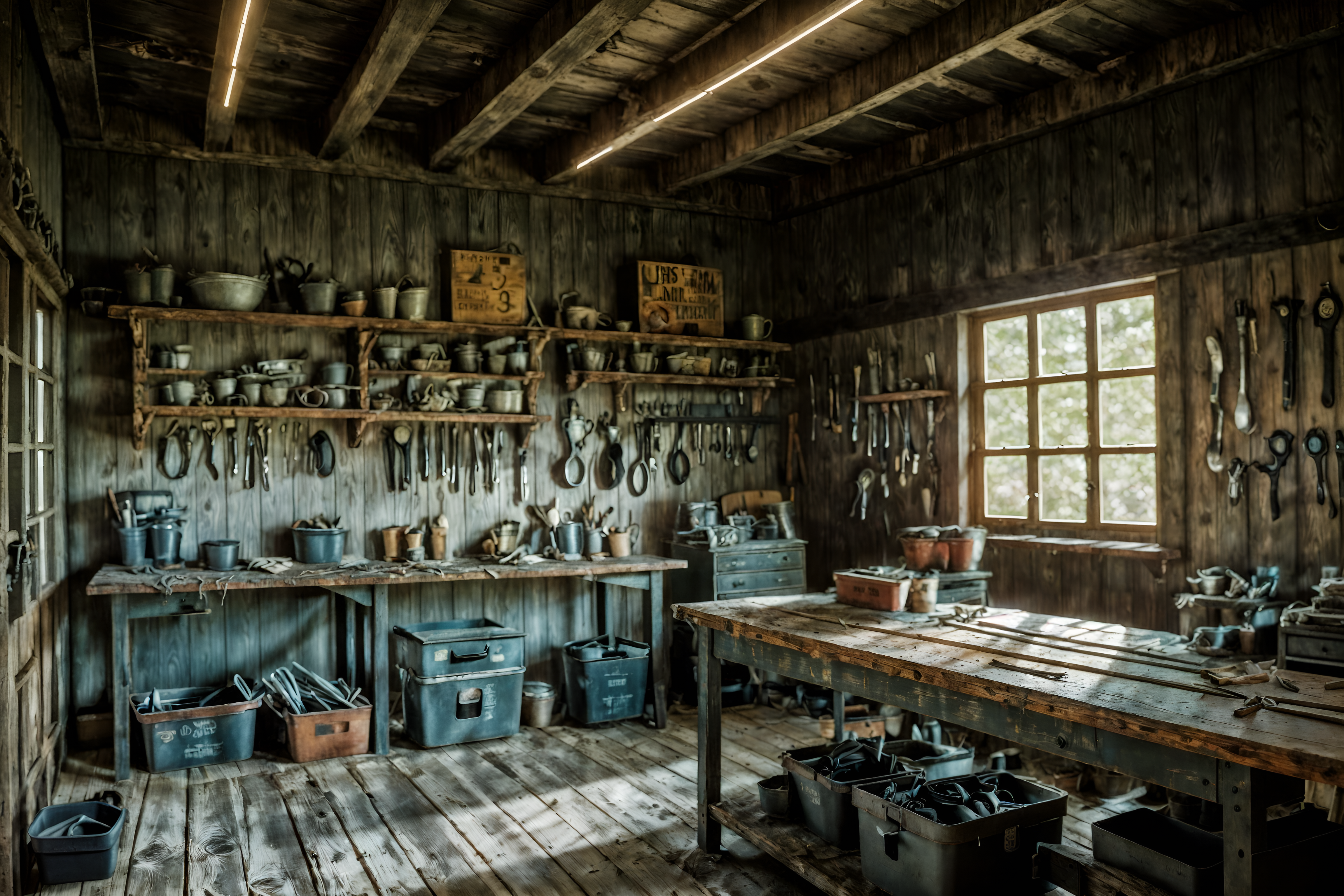 photo from pinterest of farmhouse-style interior designed (workshop interior) with messy and wooden workbench and tool wall and messy. . with . . cinematic photo, highly detailed, cinematic lighting, ultra-detailed, ultrarealistic, photorealism, 8k. trending on pinterest. farmhouse interior design style. masterpiece, cinematic light, ultrarealistic+, photorealistic+, 8k, raw photo, realistic, sharp focus on eyes, (symmetrical eyes), (intact eyes), hyperrealistic, highest quality, best quality, , highly detailed, masterpiece, best quality, extremely detailed 8k wallpaper, masterpiece, best quality, ultra-detailed, best shadow, detailed background, detailed face, detailed eyes, high contrast, best illumination, detailed face, dulux, caustic, dynamic angle, detailed glow. dramatic lighting. highly detailed, insanely detailed hair, symmetrical, intricate details, professionally retouched, 8k high definition. strong bokeh. award winning photo.