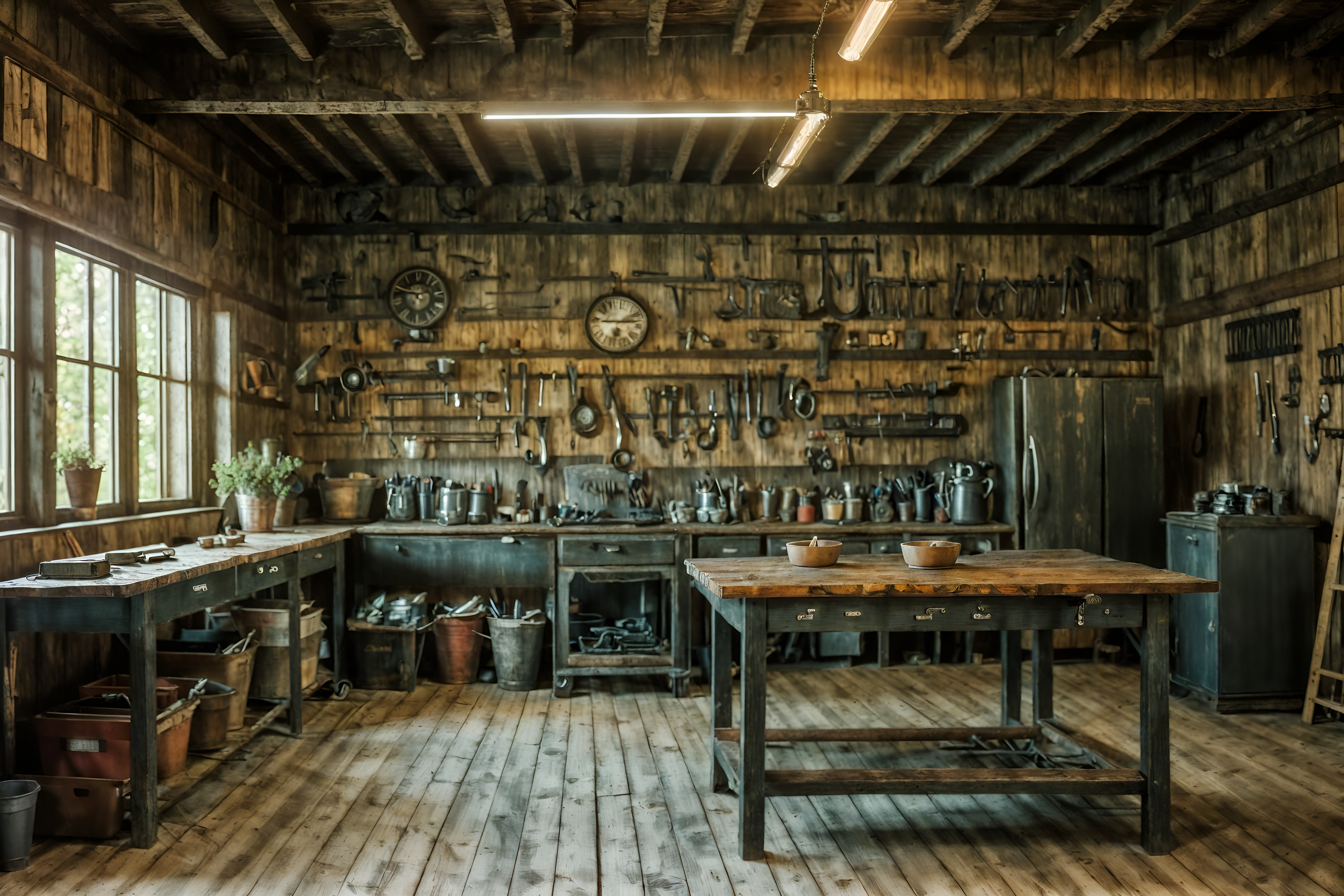 photo from pinterest of farmhouse-style interior designed (workshop interior) with tool wall and messy and wooden workbench and tool wall. . with . . cinematic photo, highly detailed, cinematic lighting, ultra-detailed, ultrarealistic, photorealism, 8k. trending on pinterest. farmhouse interior design style. masterpiece, cinematic light, ultrarealistic+, photorealistic+, 8k, raw photo, realistic, sharp focus on eyes, (symmetrical eyes), (intact eyes), hyperrealistic, highest quality, best quality, , highly detailed, masterpiece, best quality, extremely detailed 8k wallpaper, masterpiece, best quality, ultra-detailed, best shadow, detailed background, detailed face, detailed eyes, high contrast, best illumination, detailed face, dulux, caustic, dynamic angle, detailed glow. dramatic lighting. highly detailed, insanely detailed hair, symmetrical, intricate details, professionally retouched, 8k high definition. strong bokeh. award winning photo.