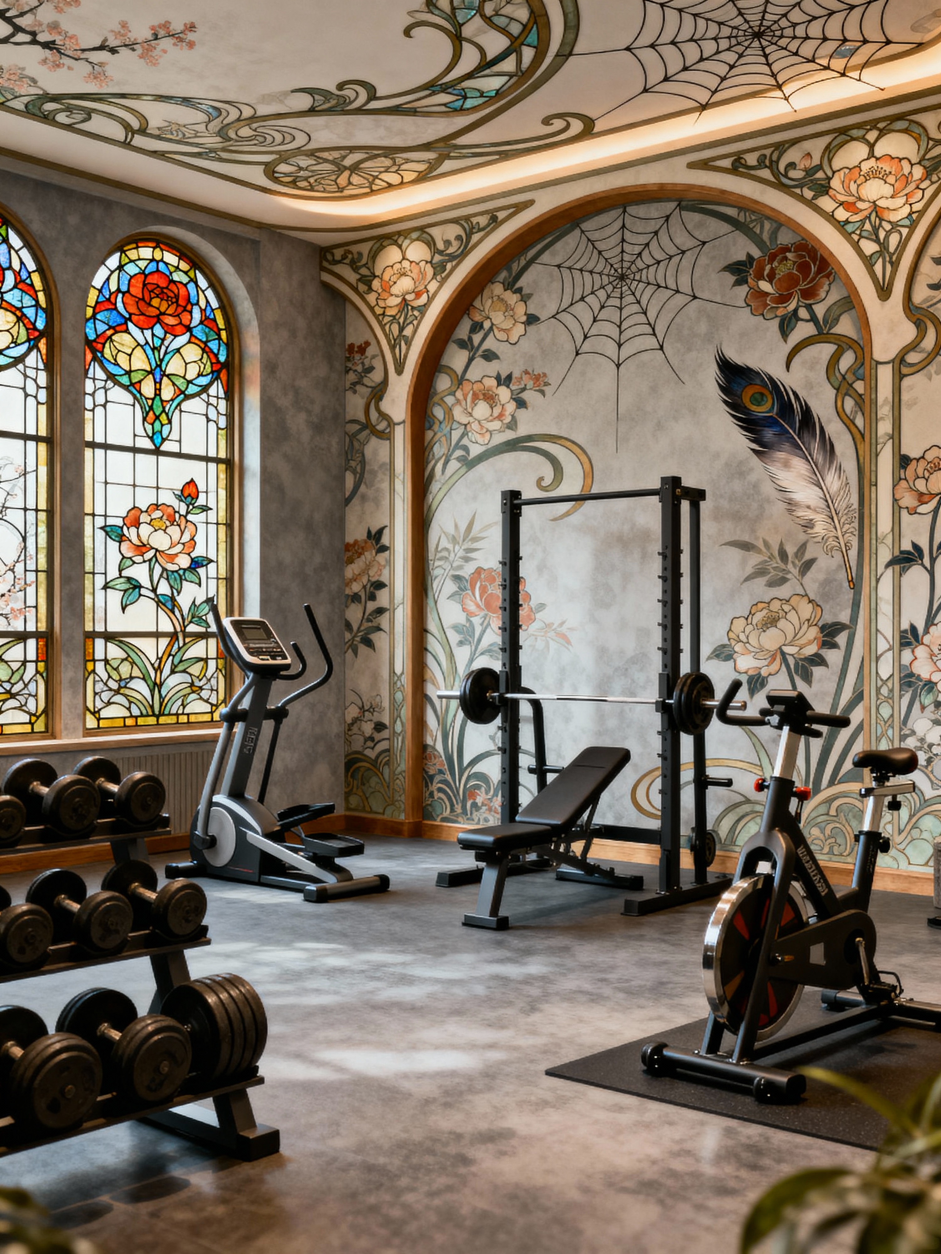 fitness gym with art nouveau style with dumbbell stand and crosstrainer and bench press and squat rack and exercise bicycle and dumbbell stand. . with stained glass and japanese motifs and wallpaper patterns of stylized flowers and arches and curved forms and wallpaper pattners of spider webs and ashy colors and wallpaper patterns of feathers and natural materials