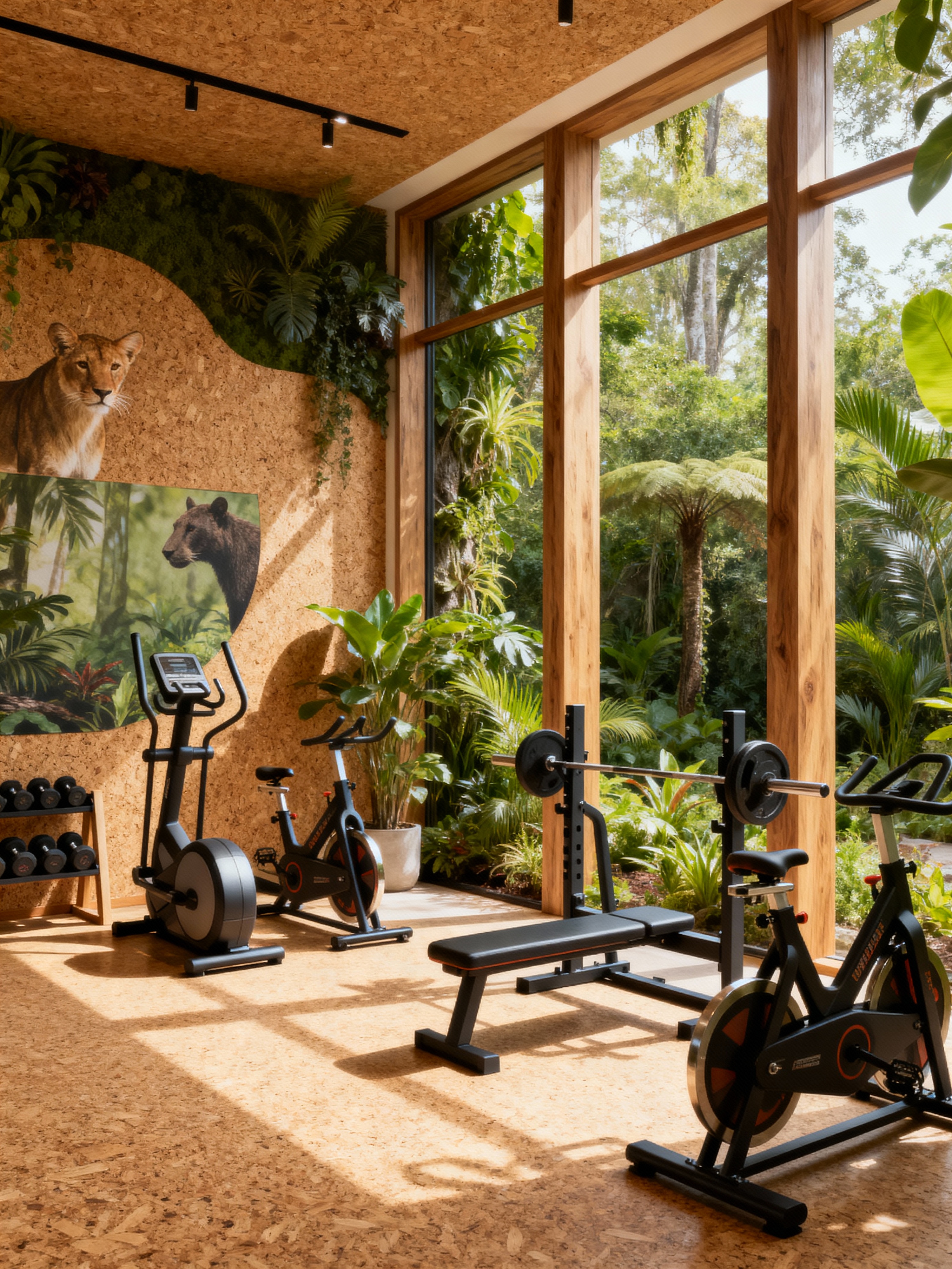 fitness gym with biophilic style with exercise bicycle and crosstrainer and squat rack and bench press and dumbbell stand and exercise bicycle. . with natural shapes and forms and plants and cork materials and images of animals and sunlight and fresh air and features of the natural world and wood materials