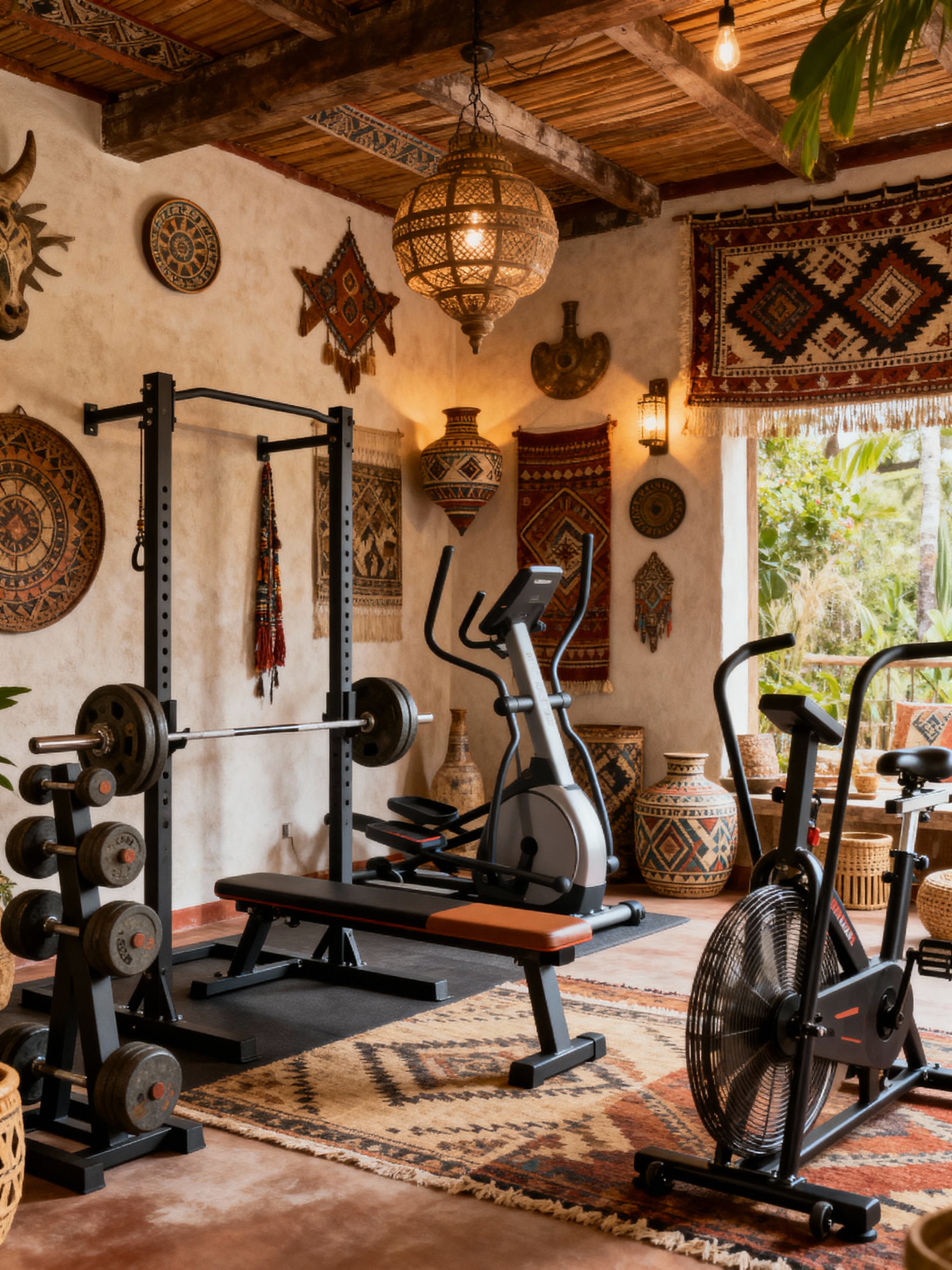 fitness gym with boho-chic style with dumbbell stand and squat rack and crosstrainer and bench press and exercise bicycle and dumbbell stand. . with vintage finds and artistic touches and mixed patterns and global artifacts and free-spirited and natural materials and eclectic mix and earthy colors