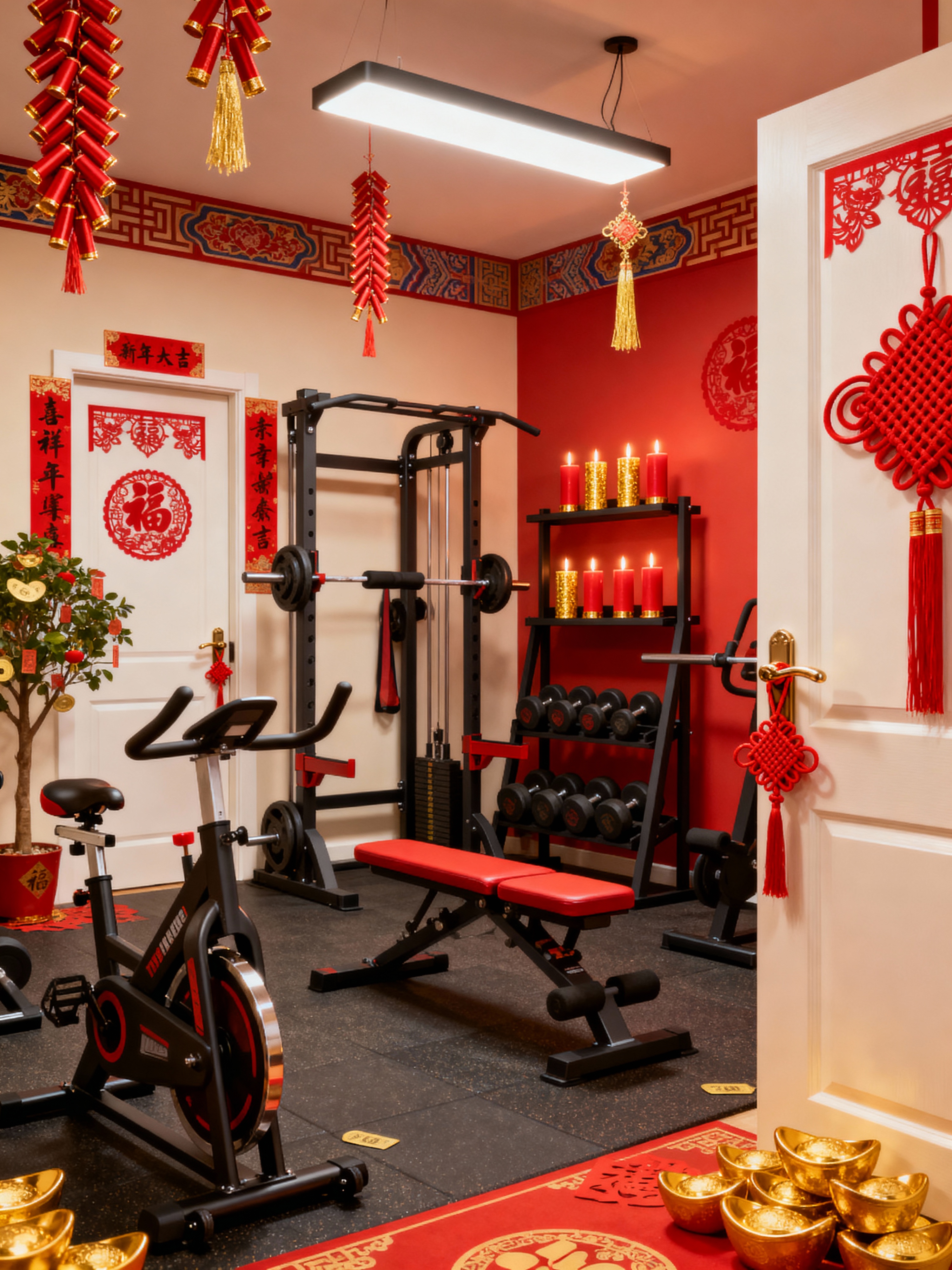 fitness gym with chinese new year style with exercise bicycle and squat rack and dumbbell stand and bench press and crosstrainer and exercise bicycle. . with paper firecrackers and red and gold candles and gold ingots and chinese knots and door couplets and money tree and paper cuttings and red and gold tassels