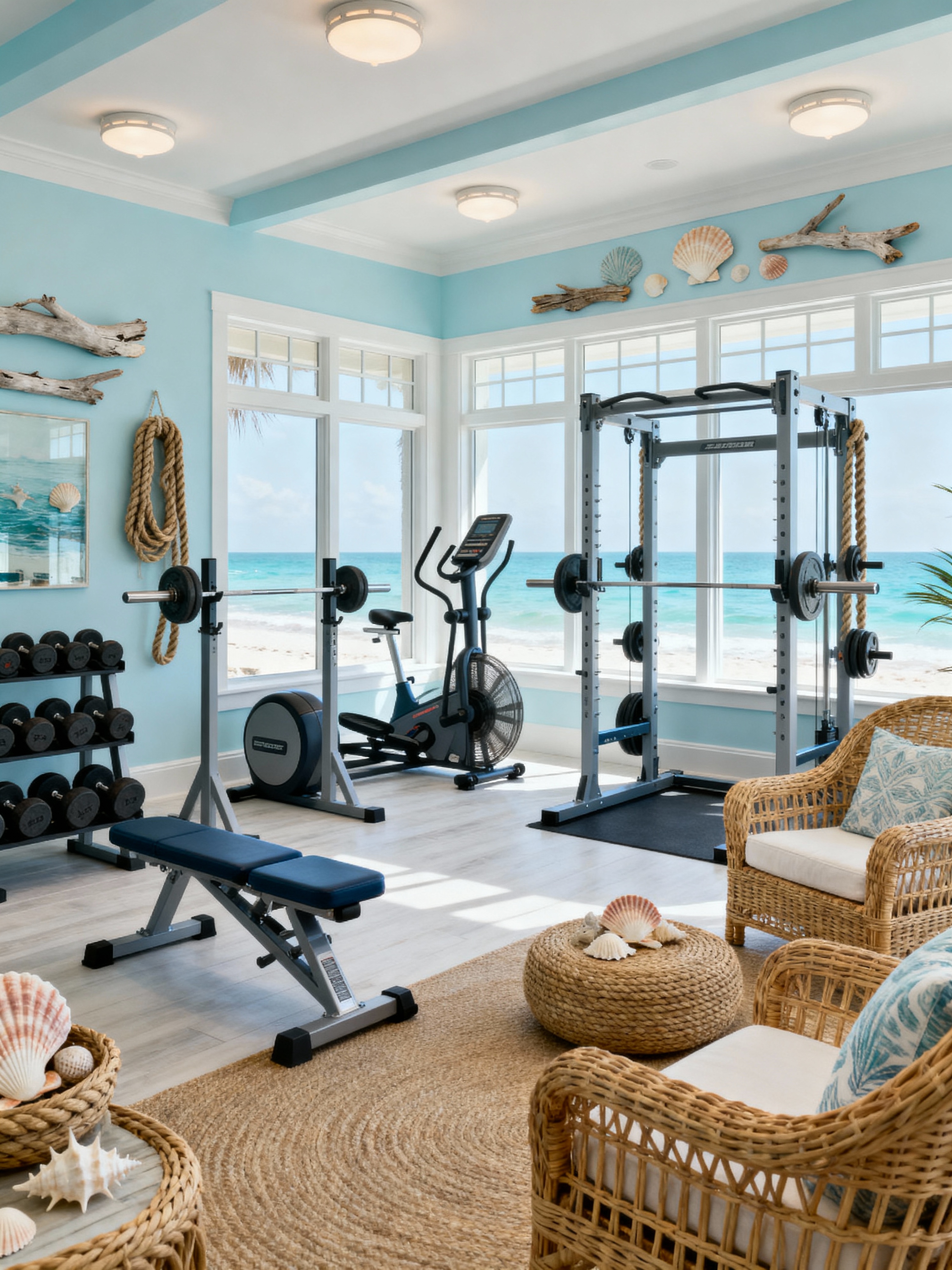fitness gym with coastal style with dumbbell stand and bench press and exercise bicycle and crosstrainer and squat rack and dumbbell stand. . with relaxed style and beach vibes and ocean-inspired and nautical decor and light blue and white decor and airy feel and wicker furniture