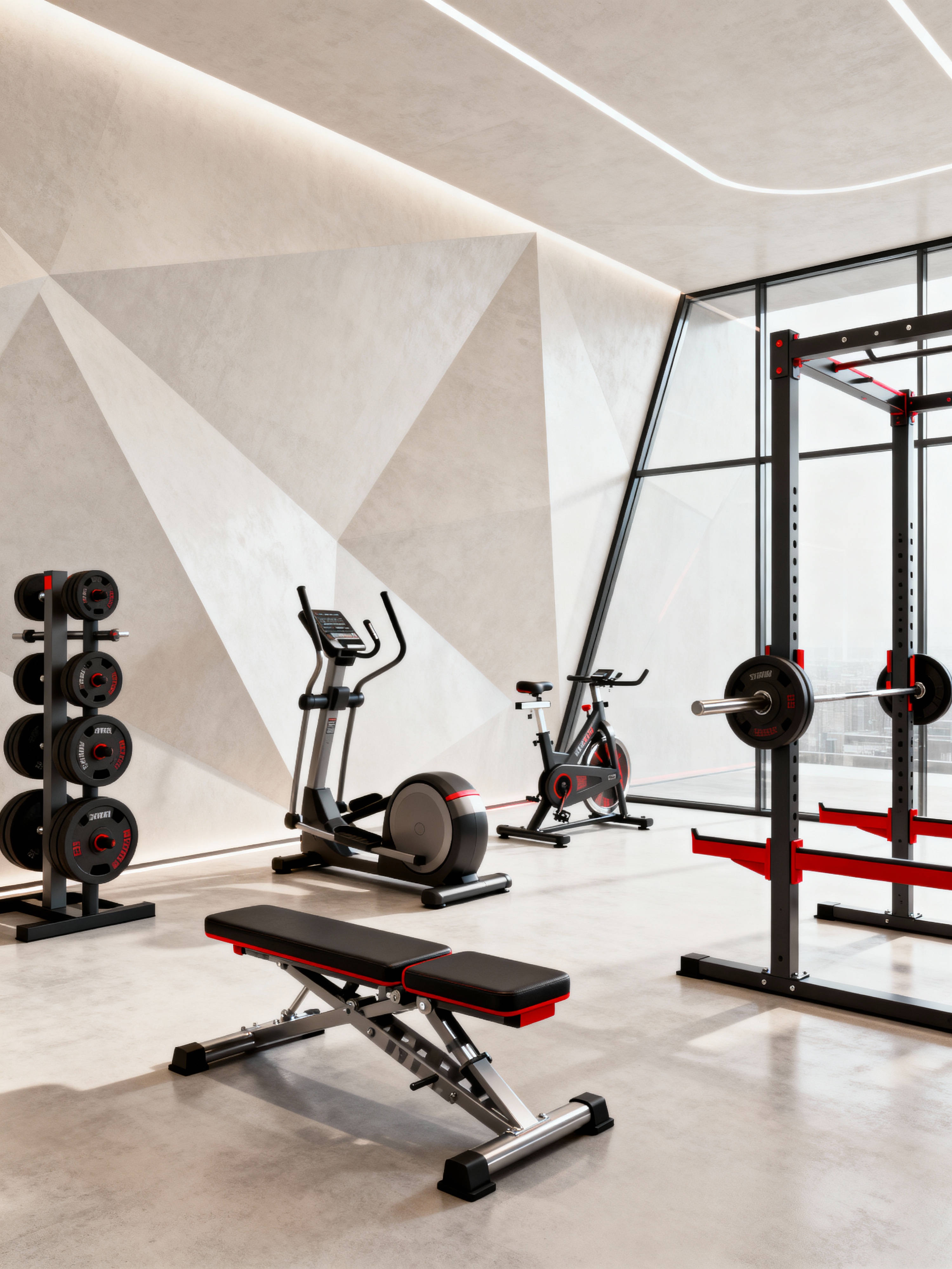 fitness gym with futuristic style with dumbbell stand and bench press and crosstrainer and exercise bicycle and squat rack and dumbbell stand. . with futuristic interior and strong geometric walls and monochromatic palette and futurism minimalist interior and neutral background and bright accents and glass panes and steel finishing and light colors