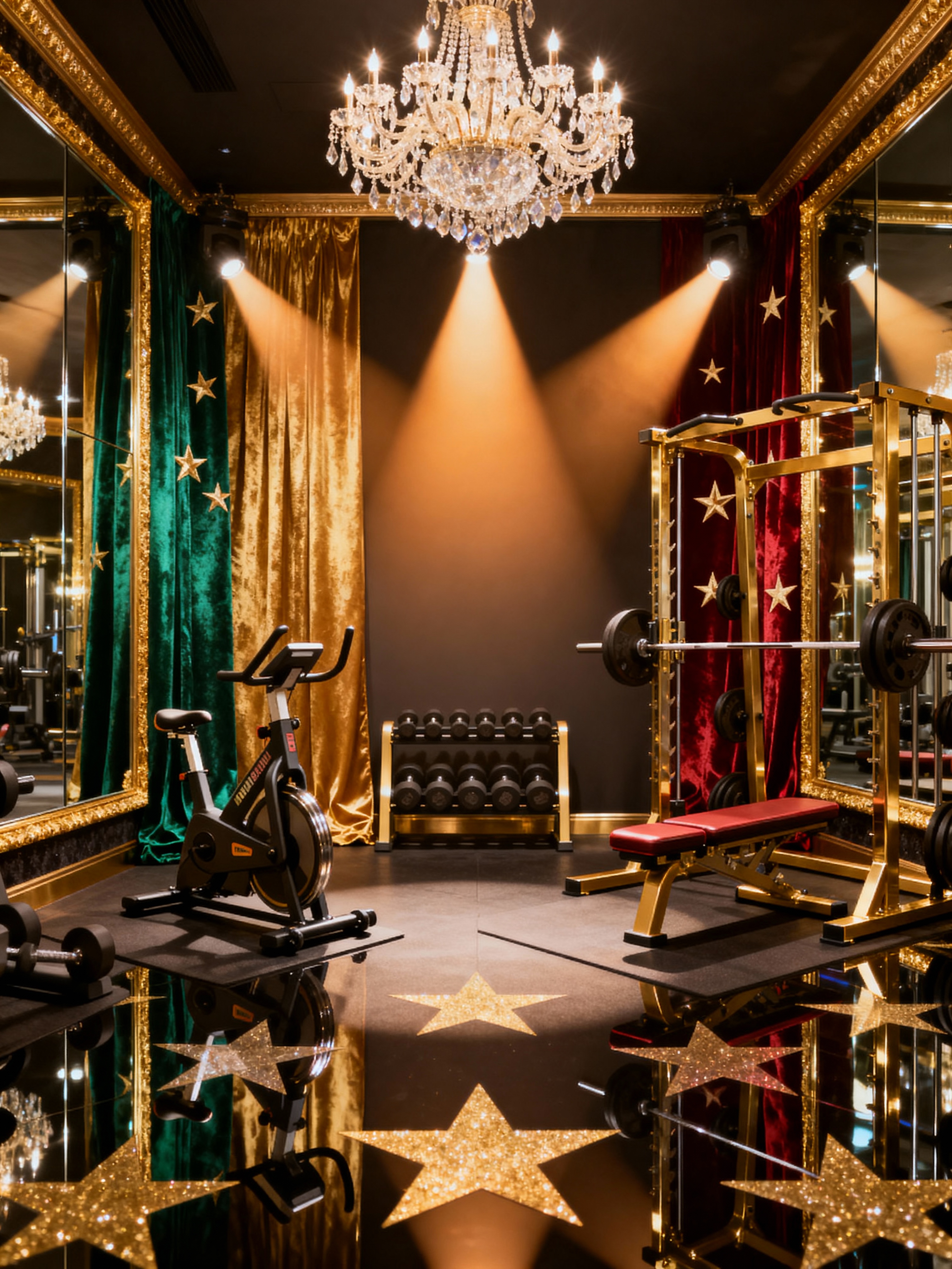 fitness gym with hollywood glam style with crosstrainer and exercise bicycle and dumbbell stand and bench press and squat rack and crosstrainer. . with crystal chandeliers and luxurious fabrics and bold colors and opulent details and star quality and dramatic lighting and glamorous style and mirrored surfaces
