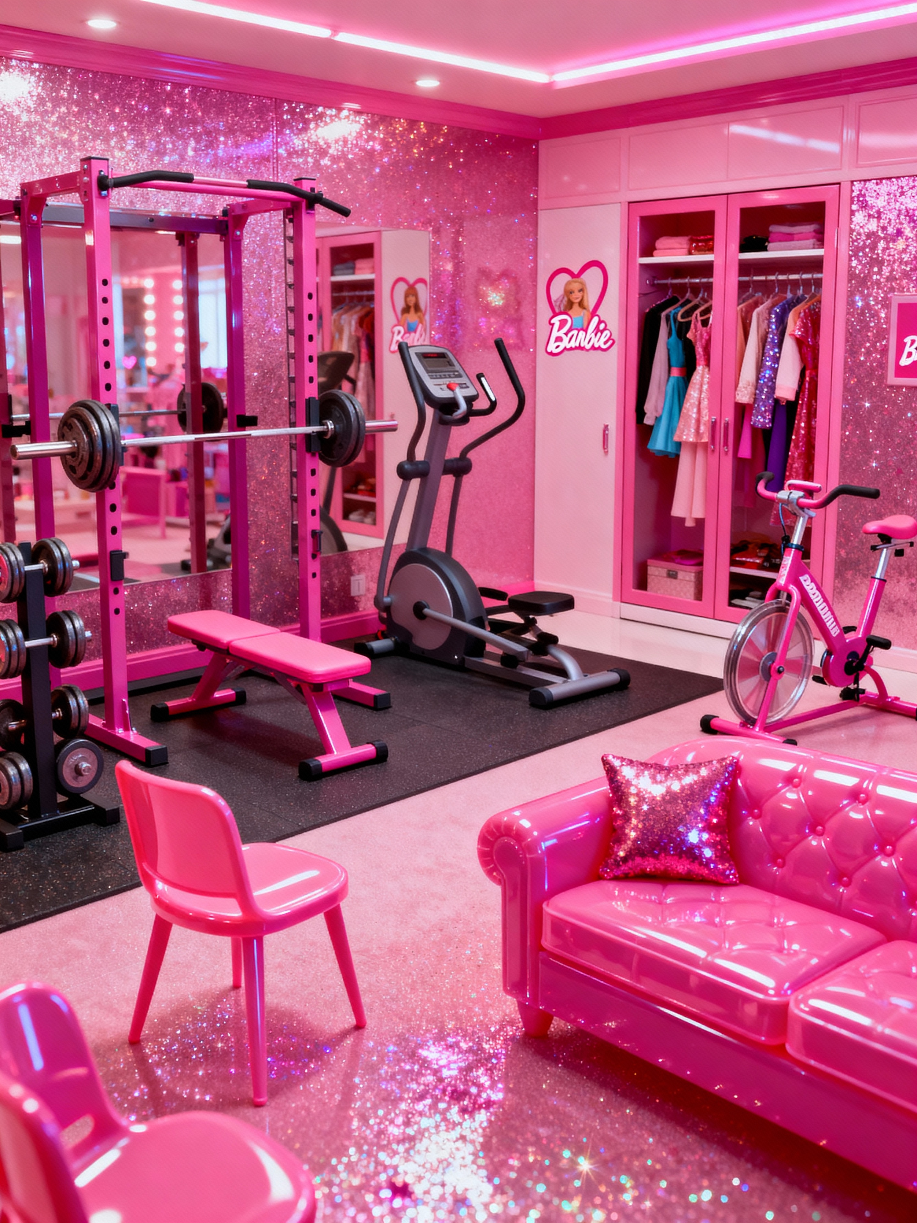 fitness gym with hot pink style with dumbbell stand and squat rack and bench press and crosstrainer and exercise bicycle and dumbbell stand. . with barbie glitter and sparkle and barbie chairs and barbie plastic interior and barbie style interior and hot pink barbie colors and barbie sofa and barbie closet and barbie bold rosy hues like fuchsia and magenta