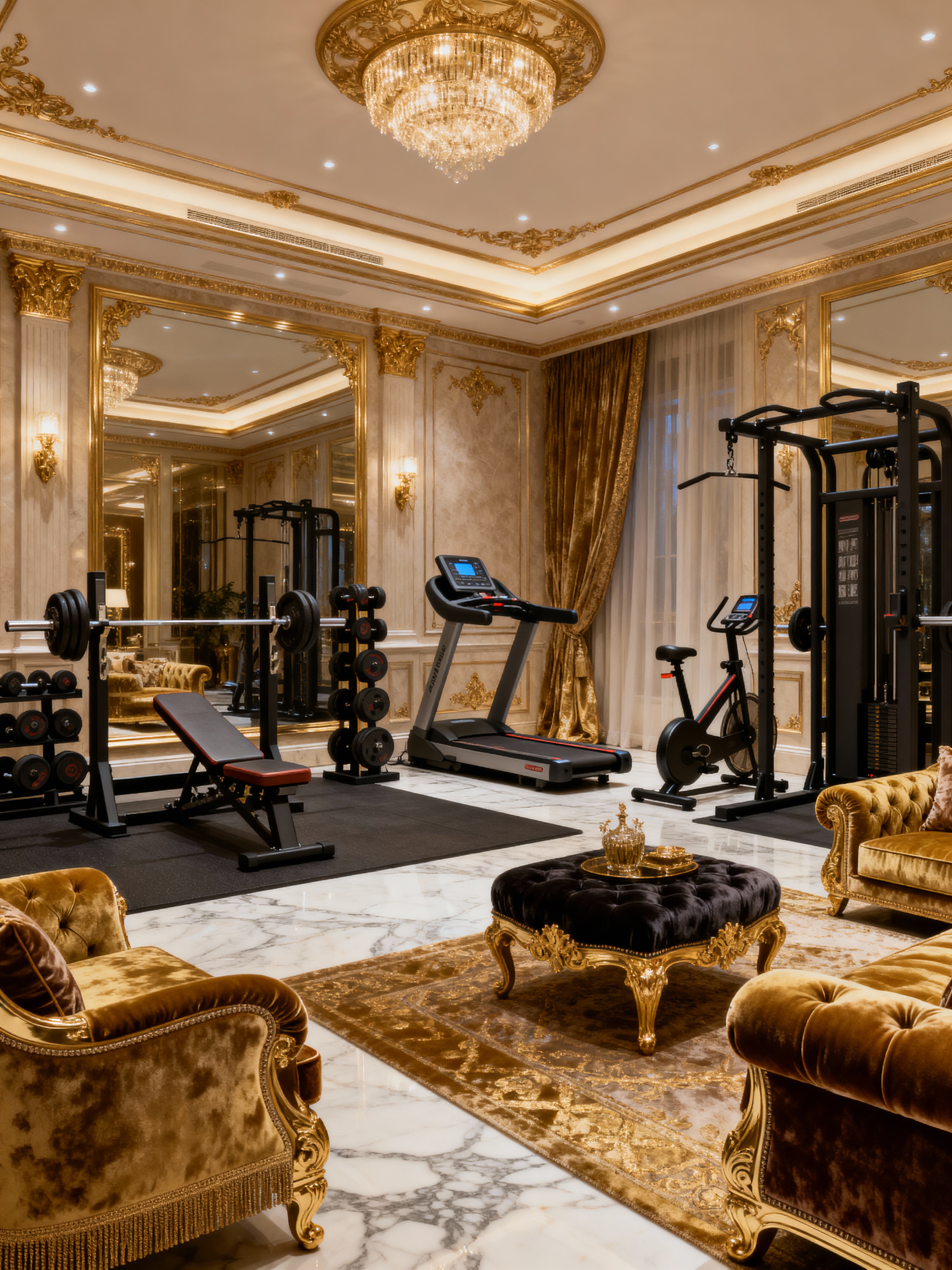 fitness gym with luxury style with bench press and crosstrainer and dumbbell stand and squat rack and exercise bicycle and bench press. . with designer furniture and sophisticated style and exclusive design and custom pieces and rich textures and lavish comfort and expensive fabrics and opulent details