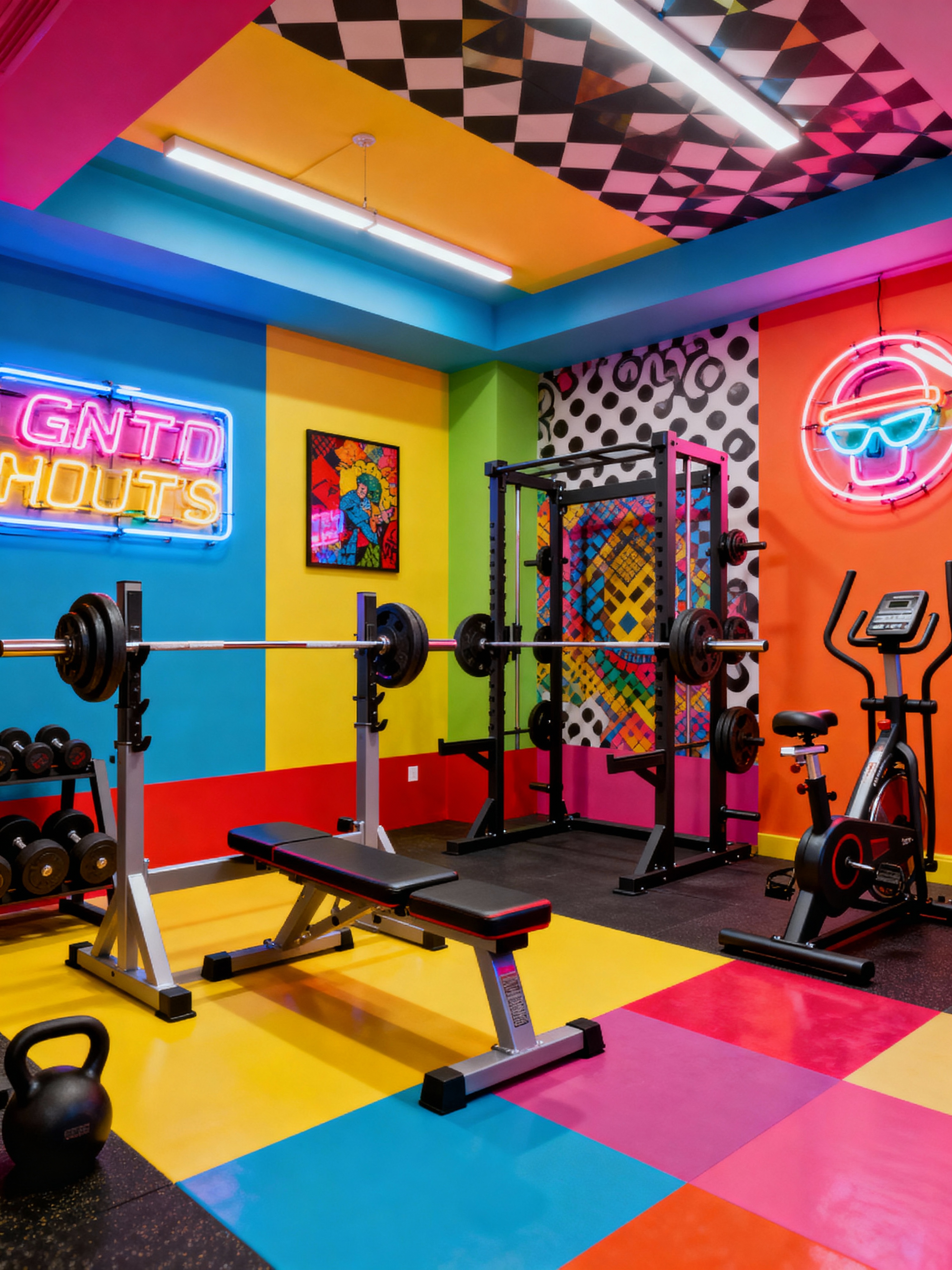 fitness gym with maximalist style with bench press and dumbbell stand and squat rack and exercise bicycle and crosstrainer and bench press. . with over-the-top aesthetic and bold design and eye-catching and more is more philosophy and bold creativity and vibrant and playful and bold colors
