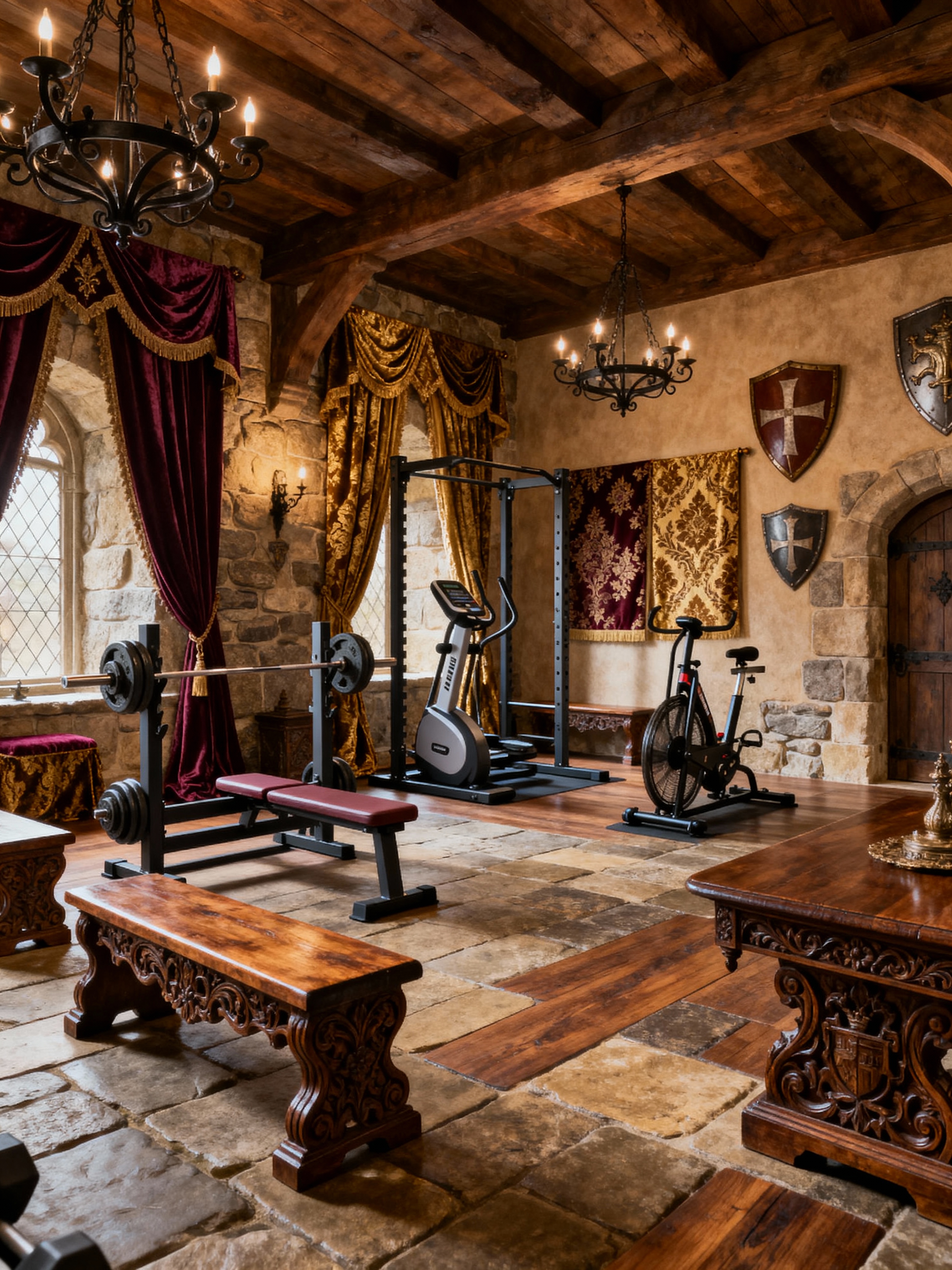 fitness gym with medieval style with dumbbell stand and bench press and crosstrainer and squat rack and exercise bicycle and dumbbell stand. . with carved wooden benches and carved wooden tables and heavy furniture pieces and timber walls and stone walls and velvet, chenille, damask, and brocade draperies and fabrics and stone or wooden floor and medieval shields on the wall