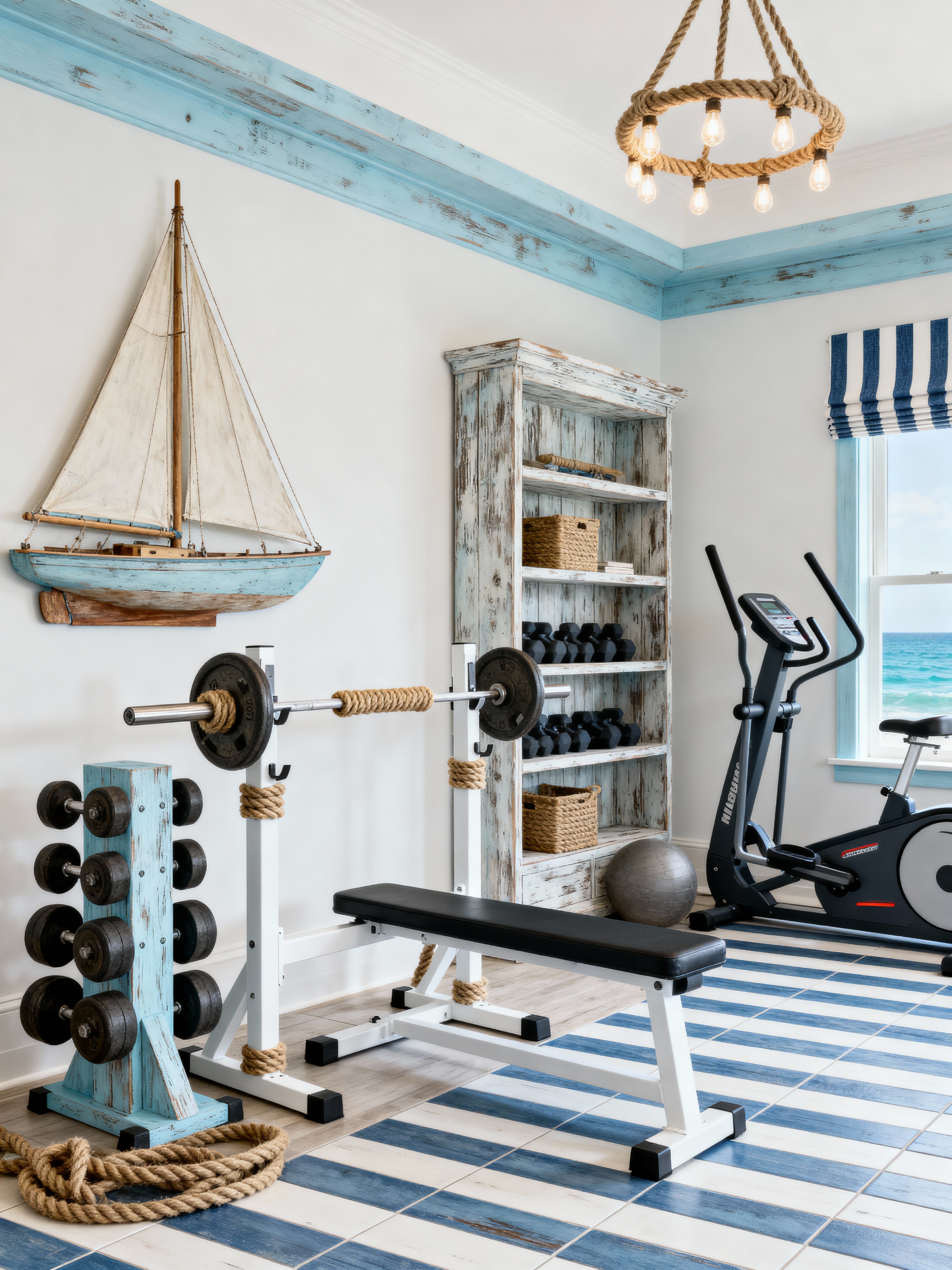 fitness gym with nautical style with bench press and dumbbell stand and squat rack and crosstrainer and exercise bicycle and bench press. . with coastal vibes and maritime decor and rope details and striped patterns and ocean inspiration and seaside charm and sailboat elements and weathered wood