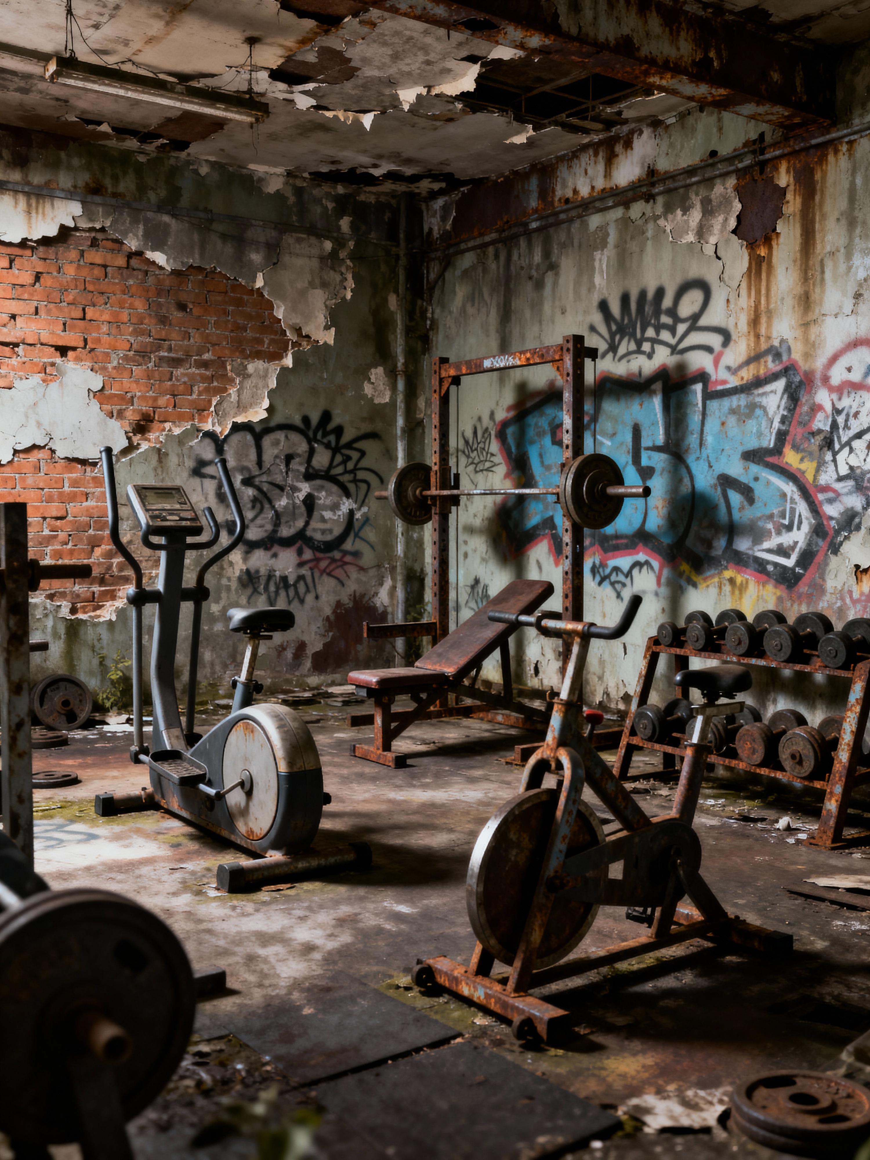 fitness gym with post-apocalyptic style with crosstrainer and squat rack and bench press and exercise bicycle and dumbbell stand and crosstrainer. . with rusted metal and graffiti on walls and post-apocalyptic and exposed bricks and urbex and worn textures and peeling paint and neglected atmosphere